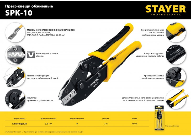 Пресс-клещи для медных наконечников и гильз STAYER Professional SPK-10 0.5 - 10 мм.кв [45440]