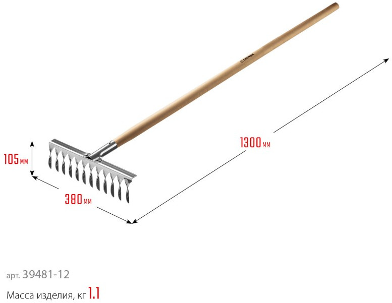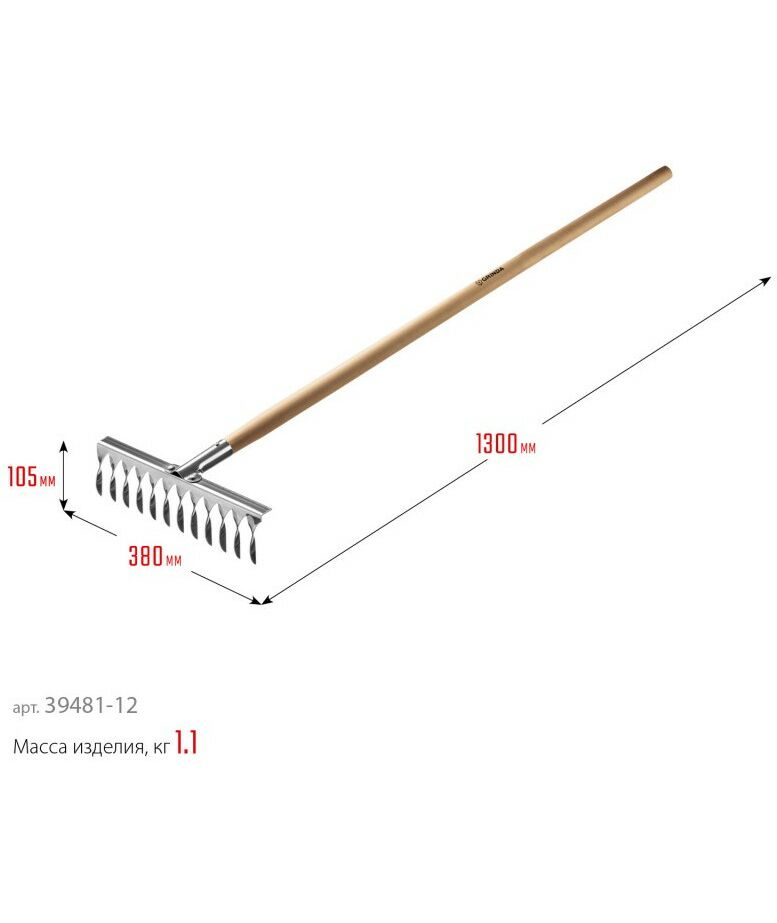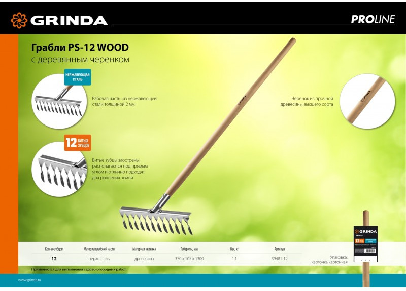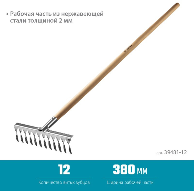 Садовые грабли GRINDA PROLine PS-12 WOOD 370 х 105 х 1300 мм, 12 витых зубцов, нержавеющая сталь, деревянный черенок [39481-12]