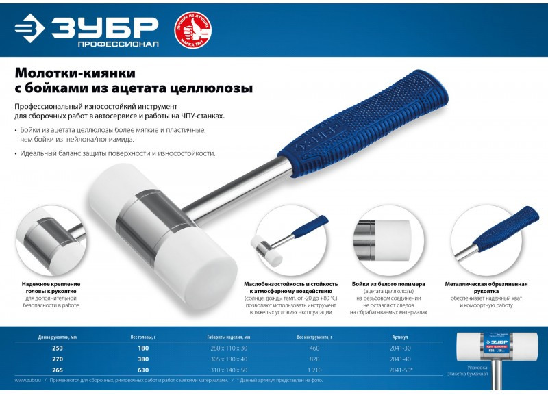 Молоток-киянка с полимерными бойками Зубр 380 г 40 мм [2041-40]