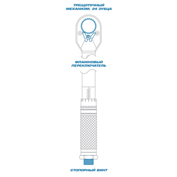 • Флажковый механизм трещотки позволяет работать в ограниченном пространстве
