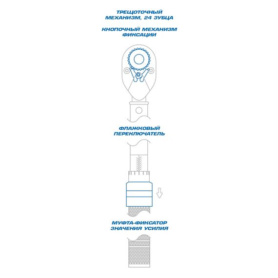• Механизм фиксации установленного значения срабатывания ключа исключает случайный проворот рукоятки;