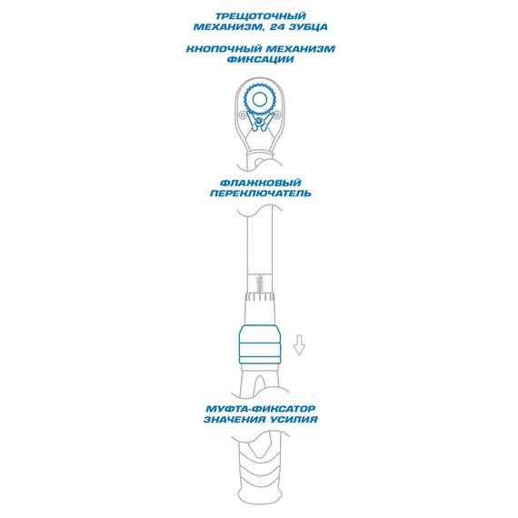 • Механизм фиксации установленного значения срабатывания ключа исключает случайный проворот рукоятки