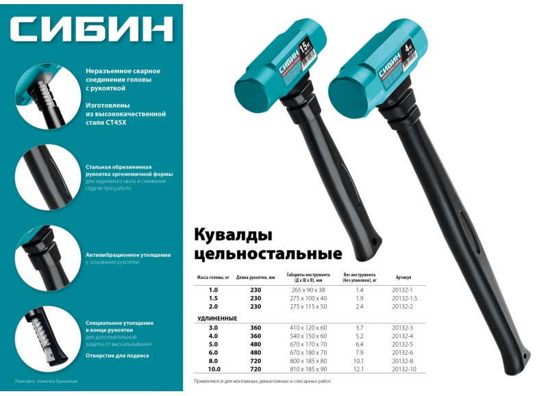 Цельностальная кувалда с удлинённой рукояткой СИБИН 10 кг 720 мм [20132-10]
