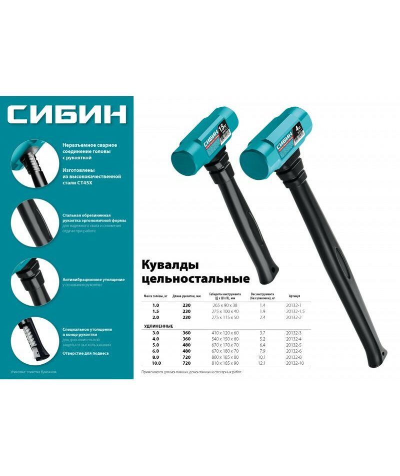 Цельностальная кувалда с удлинённой рукояткой СИБИН 8 кг 720 мм [20132-8]