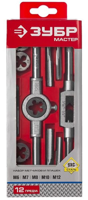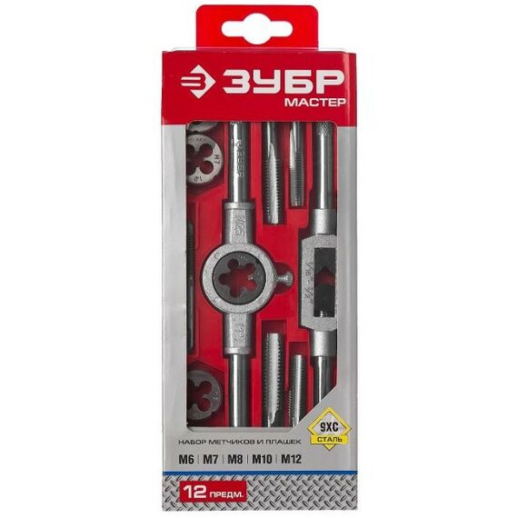Набор метчики однопроходные и плашки Зубр МАСТЕР 28121-H12 с металлорежущим Инструментом, М6-М12, оснастка - в пластиковом боксе, 12 предметов