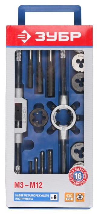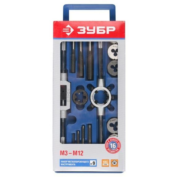 Набор метчики однопроходные и плашки Зубр МАСТЕР 28122-H16 с металлорежущим, инструментом, М3-М12, оснастка - в пластиковом боксе, 16 предметов