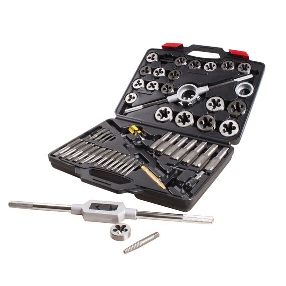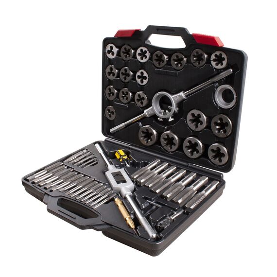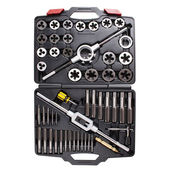 Набор для нарезания внутренней и внешней резьбы на деталях. Содержит метчики, плашки и необходимые комплектующие для проведения работ. Инструменты обладают повышенной прочностью. Изготовлены из легированной и инструментальной стали. Набор поставляется в прочном кейсе для хранения. Применяется на СТО и в мастерских.