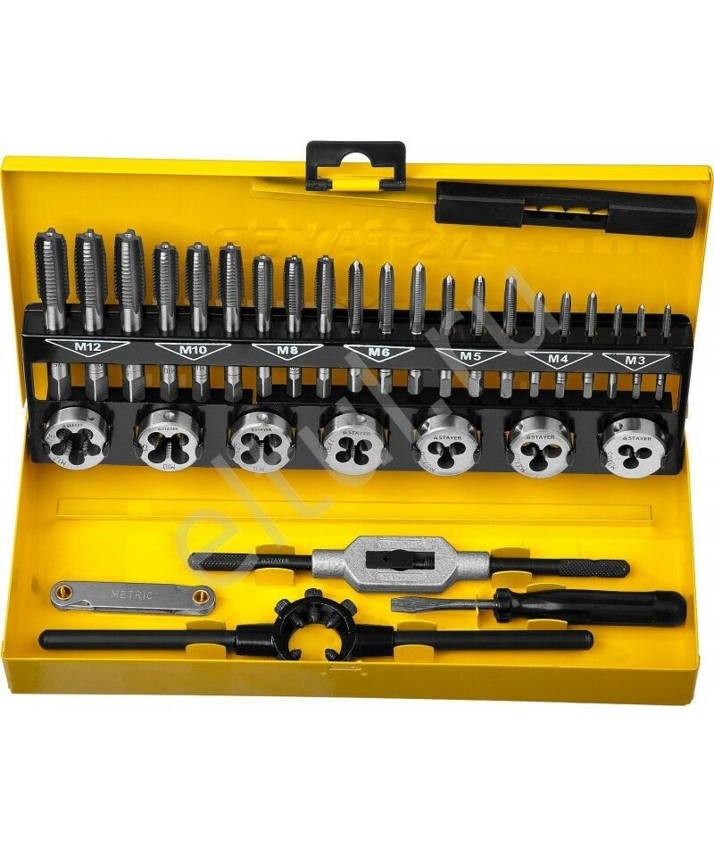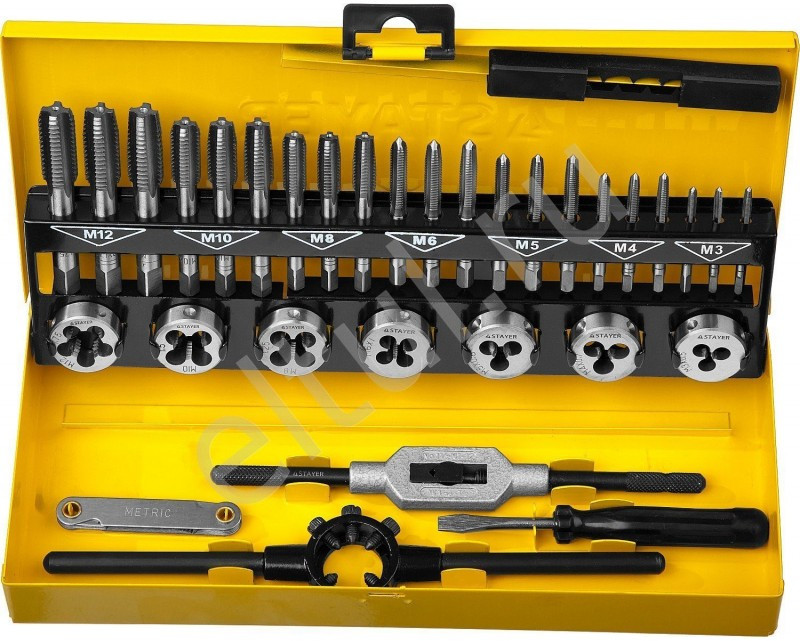 Набор метчиков и плашек STAYER MASTER плашки 7шт, метчики компл. 21шт, метчикодерж. 1шт, плашкодерж. 1шт, резьбомер 1шт, отвертка 1шт, 32 предмета [28014-H32]