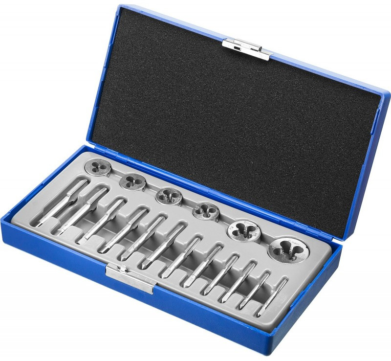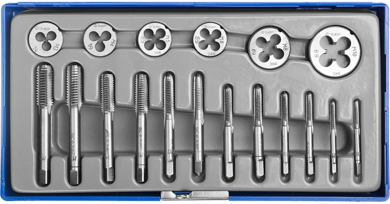 Набор предназначен для резьбонарезных работ в конструкциях и заготовках из сталей и цветных металлов. Метчики ручные однопроходные используются для нарезания внутренней метрической резьбы с нормальным шагом в глухих и сквозных отверстиях. Плашки предназначены для нарезания внешней метрической резьбы с нормальным шагом.