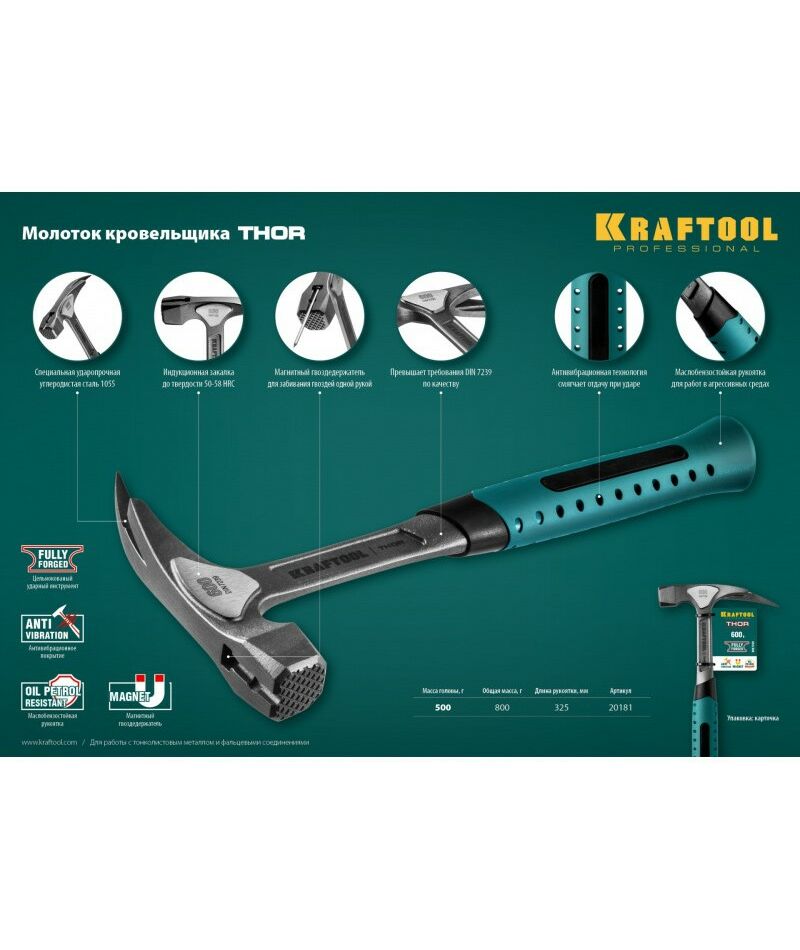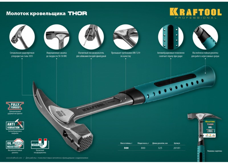 Молоток КРОВЕЛЬЩИКА KRAFTOOL THOR 600 г цельнокованый, с магнитом [20181]