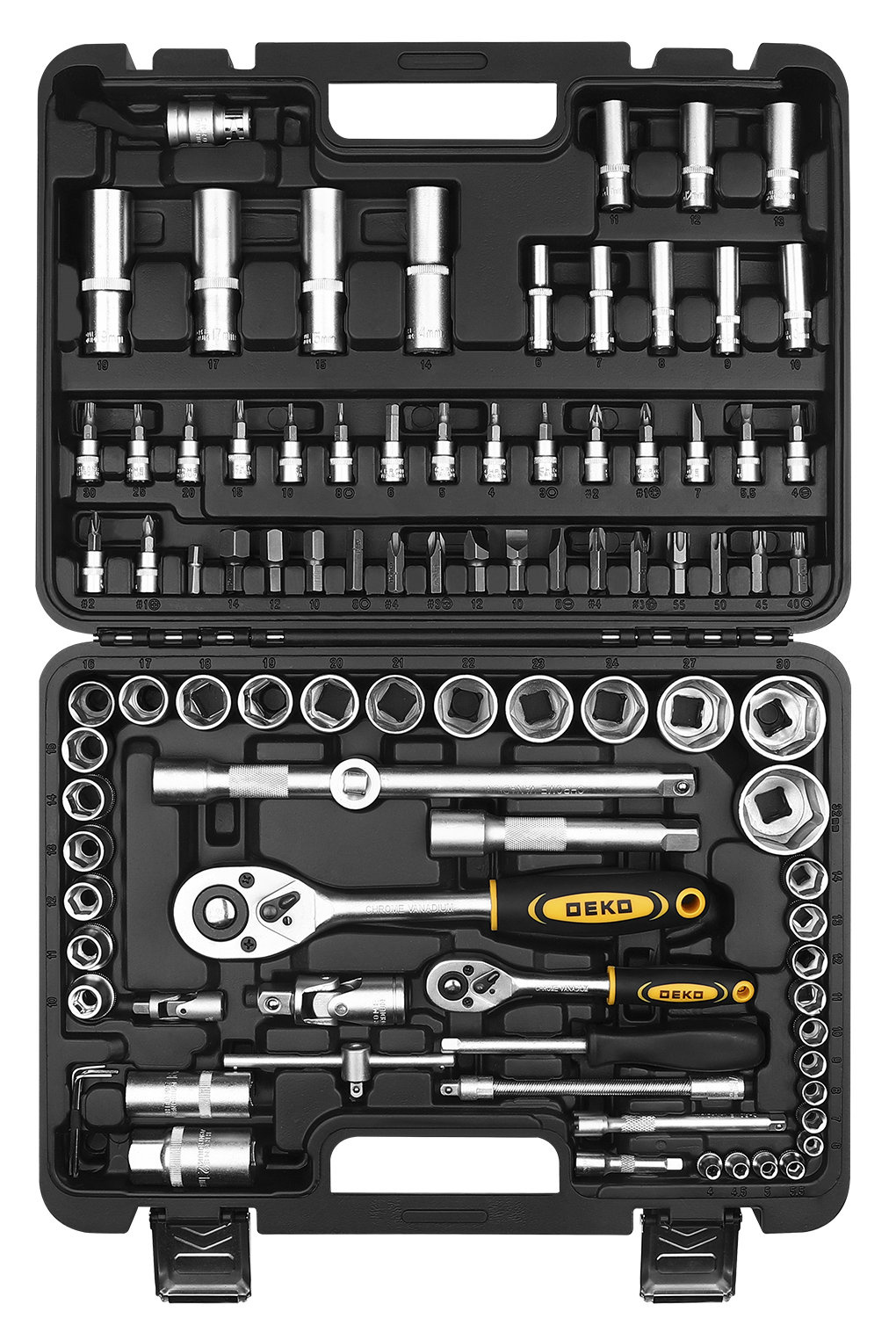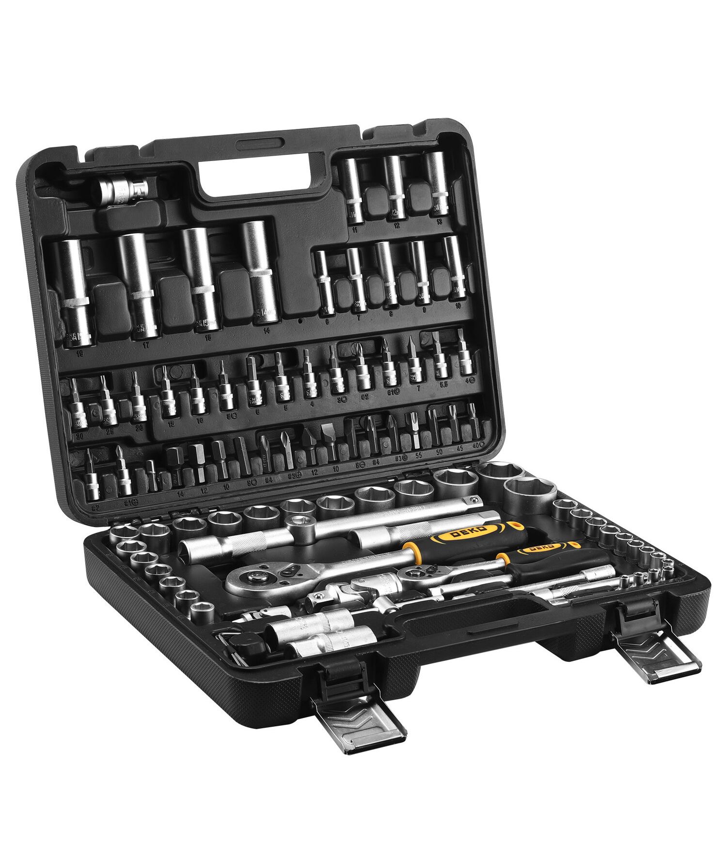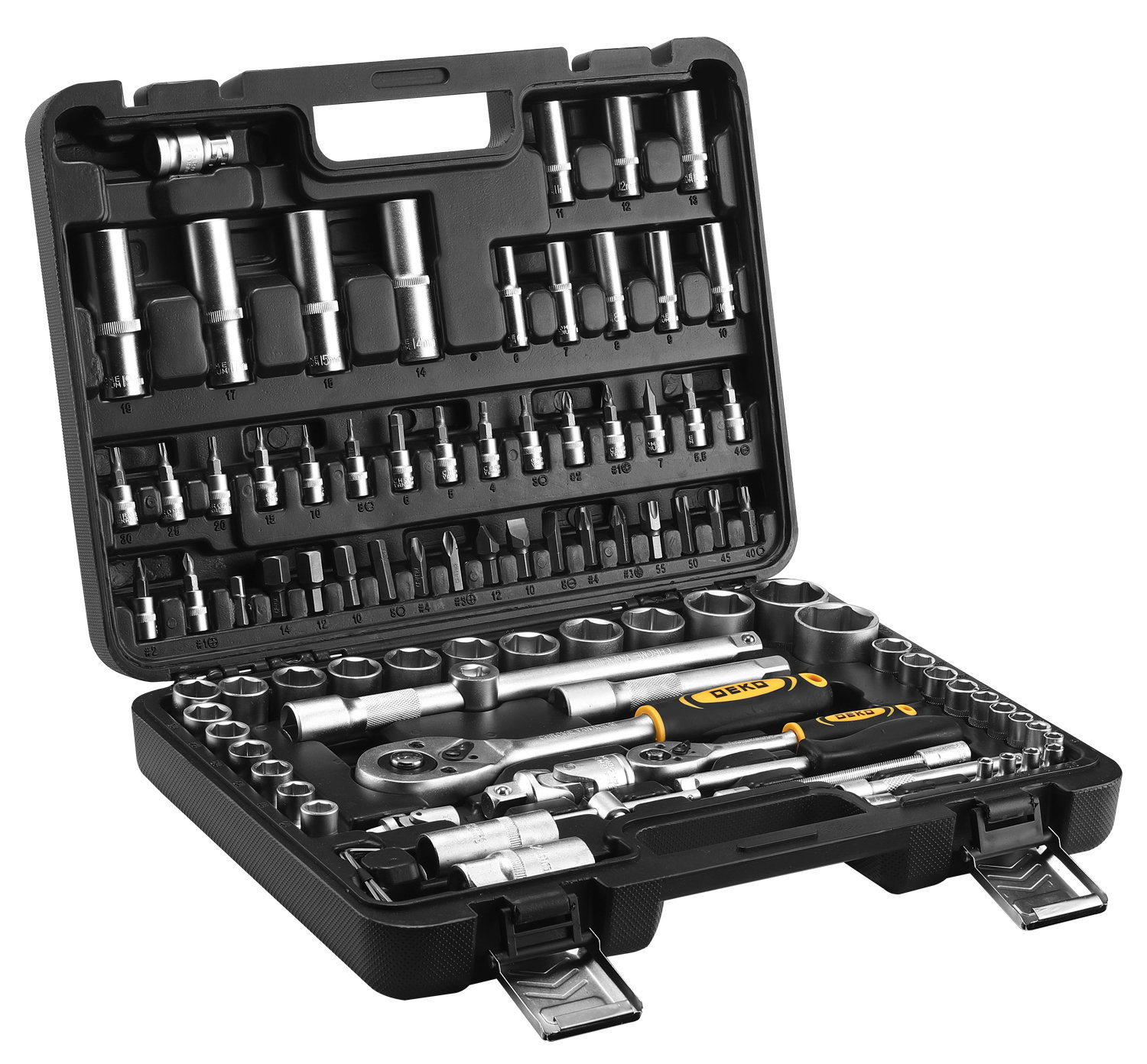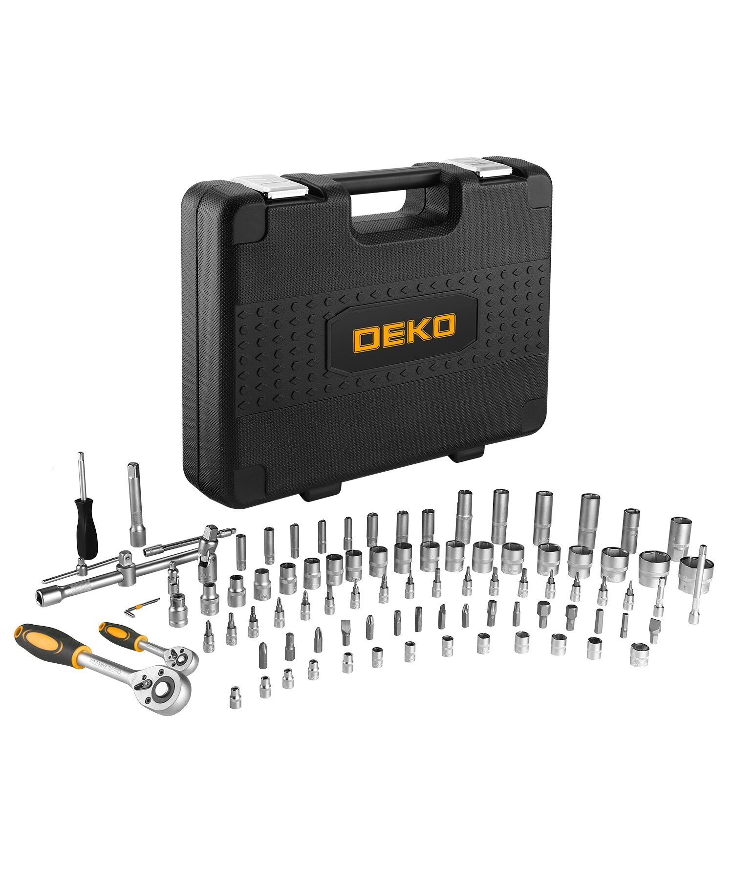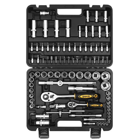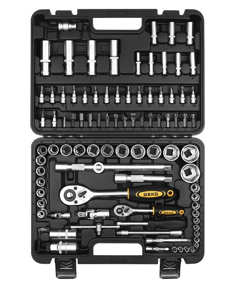 | Дополнительно в наборе, 1 / 2"DR | Шарнир карданныйПереходник для головок торцевыхУдлинитель торцевых головок 5", 10"Переходник для бит Х8 мм |