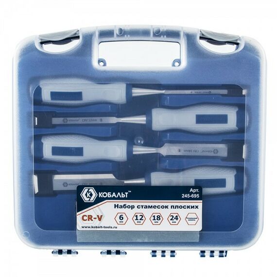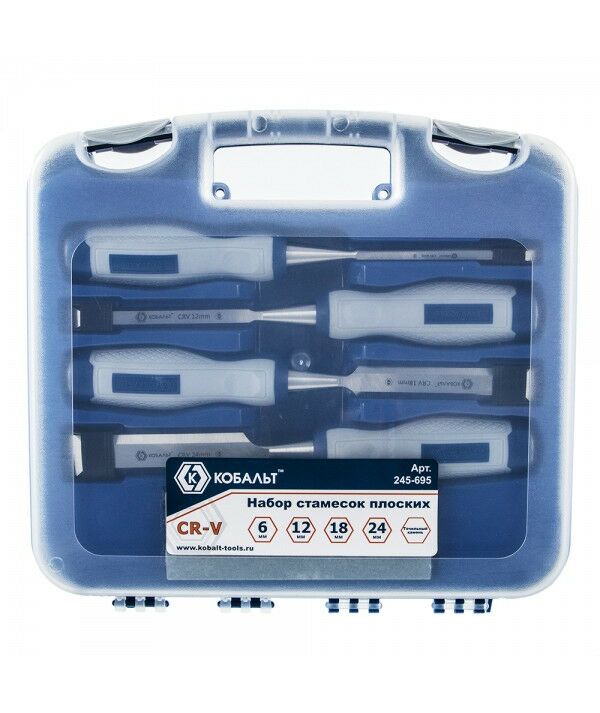 Набор стамесок плоских Кобальт 245-695 6, 12, 18, 24 х 140 мм, CR-V, двухкомпонентная рукоятка, точильный камень, 4 шт, кейс