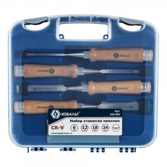 Набор стамесок плоских Кобальт 245-893 6, 12, 18, 24 х 140 мм, CR-V, деревянная рукоятка, точильный камень, 4 шт, кейс