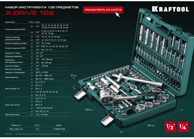 Универсальный набор инструмента KRAFTOOL X-Drive 108 108 предметов, 1/2"+3/8"+1/4" [27888-H108_z03]