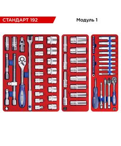КОМПЛЕКТАЦИЯ Набор инструментов «СТАНДАРТ» 5-00192 192 предмета / 10 ложементов / 3 модуля • СТАНДАРТ • Модуль 1 1/2" Головки и принадлежности 28 предметов 5-004028 (EVA 380×270 мм) Короткие 6-гранные 8, 10, 11, 12, 13, 14, 15, 16, 17, 18, 19, 20, 22, 23, 24, 26, 27, 30,...