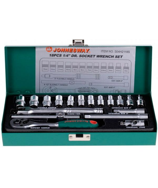 Набор инструмента включает торцевые головки с шестигранным профилем под квадрат 1/4" (всего 12 штук), ключ-трещотку, вороток шарнирный, Т-образный вороток с плавающей головкой, а также удлинители и кардан.