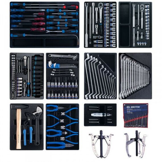 Набор с инструментом торговой марки KING TONY предназначен для организации рабочего места в любом производственном помещении, станции технического обслуживания или авторемонтной мастерской.