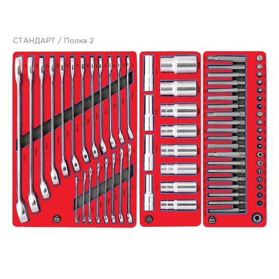 Стандартизация размерности ложементов позволяет разместить наборы на ваше усмотрение в любом варианте организации рабочего пространства – по типу, назначению или частоте использования. У вас всегда будет под рукой именно тот инструмент или приспособление, которое вам необходимо в данную минуту, а ячейки ложементов позволят содержать набор в полном порядке.