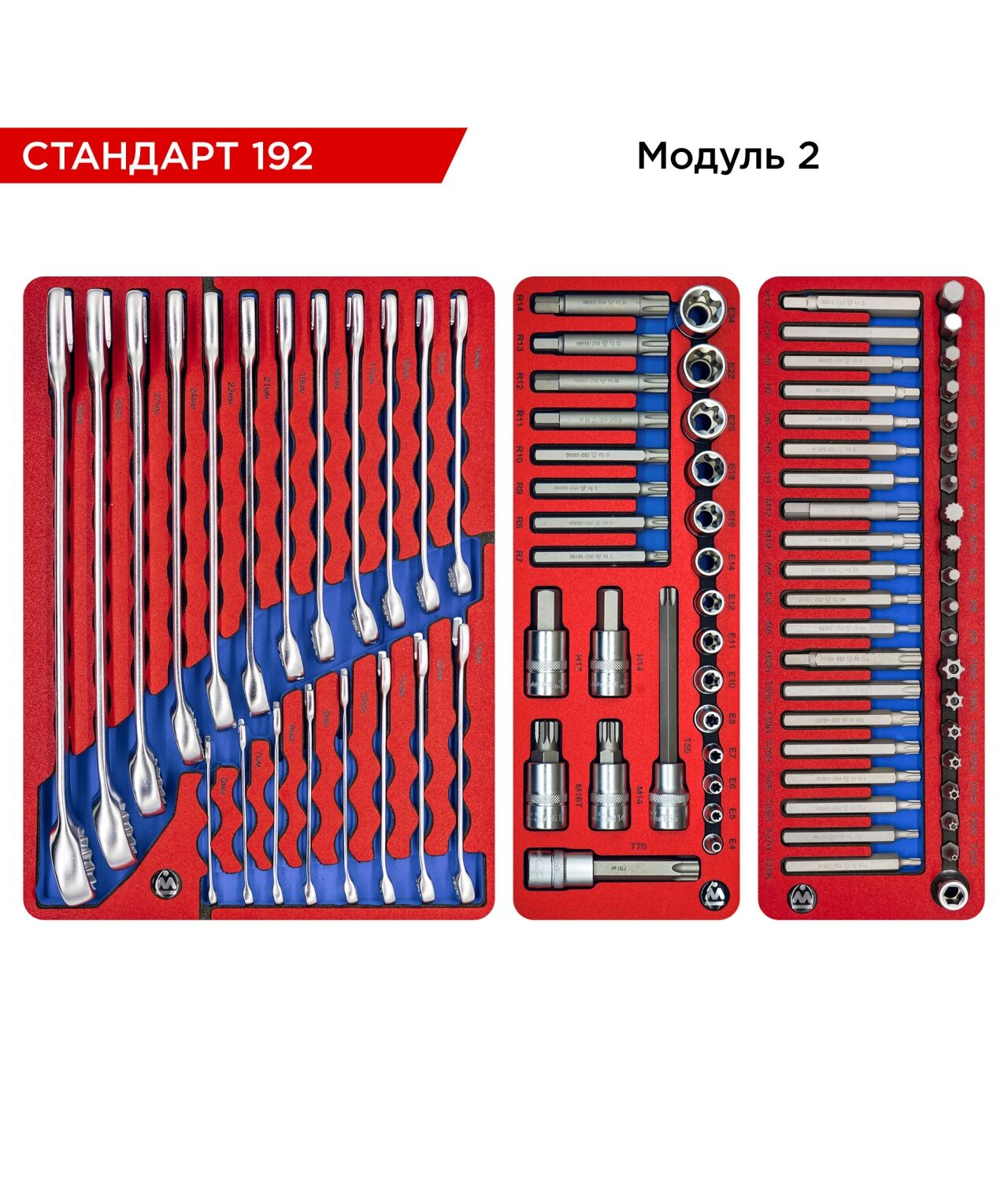 Стандартизация размеров ложементов позволяет разместить наборы на ваше усмотрение в любом варианте организации рабочего пространства – по типу, назначению или частоте использования. Вы всегда будете иметь под рукой тот инструмент или приспособление, которое вам необходимо в данную минуту, а ячейки ложементов позволят содержать набор в полном порядке.