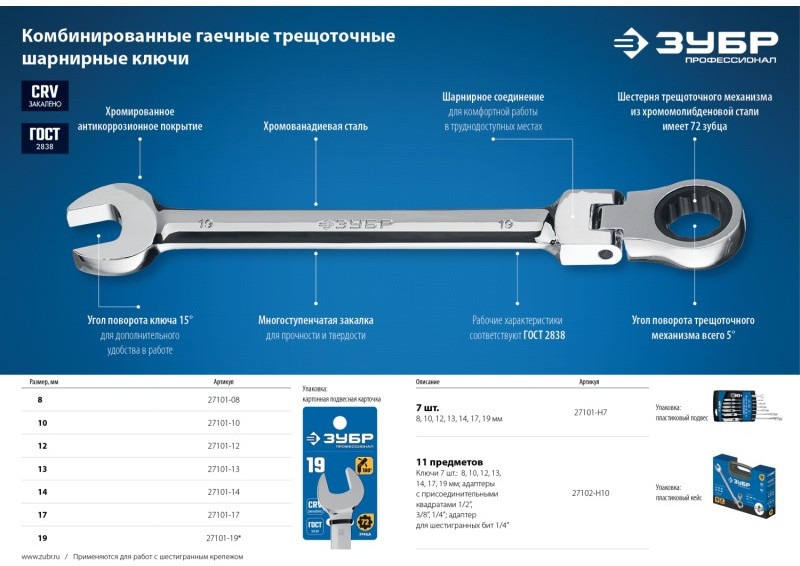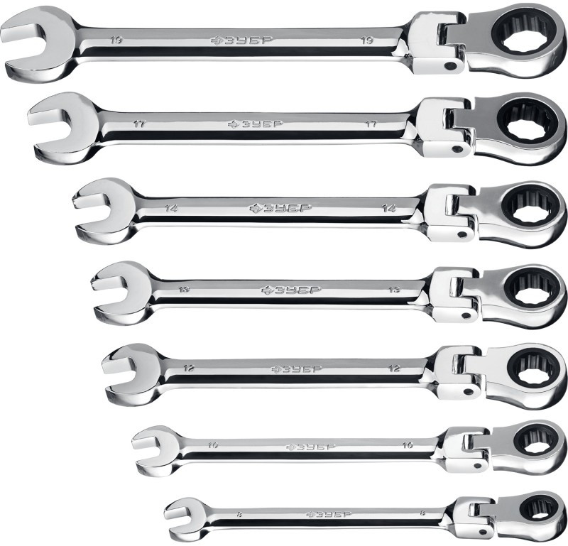 Набор комбинированных гаечных ключей трещоточных шарнирных Зубр 27101-H7 7 шт, 8 - 19 мм