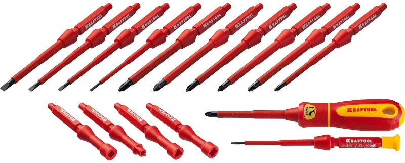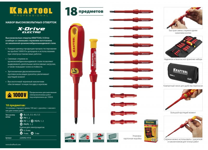 Набор KRAFTOOL Х-Drive ELECTRO высоковольтные отвертки, сменные стержни, ключи специальные, до 1000В, 18 предметов [220092-H18]