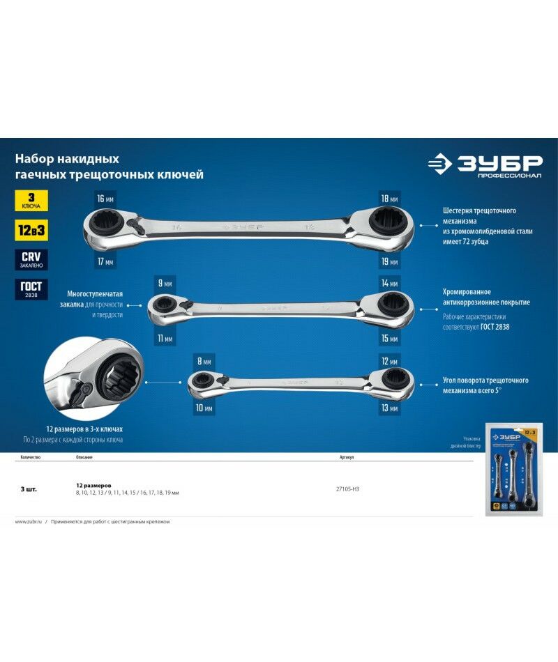 Набор накидных гаечных ключей трещоточных Зубр 27105-H3 3 шт, 8 - 19 мм