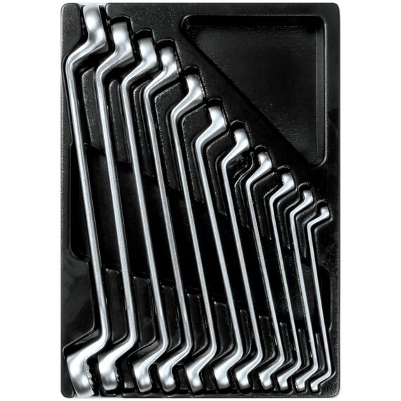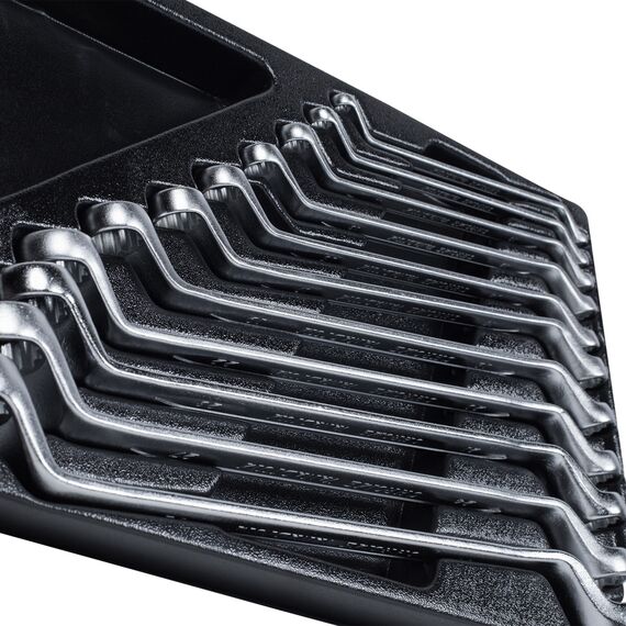 Геометрия ключей позволяет применять их при работе с крепежом, находящимся в углублении либо в ограниченном пространстве. На ключи накидные KING TONY распространяется пожизненная гарантия, что даёт возможность применения их в профессиональных целях. Материал ложемента – ПВХ (поливинилхлорид). Изготовлен специально для комплектации инструментальной тележки.