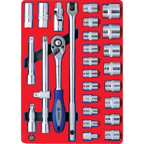 Набор инструментов 28 предметов торцевые головки с присоединительным квадратом 1/2 дюйма и аксессуары Мастак 5-004028 в ложементе из материала EVA предназначен для комплектации передвижных инструментальных тележек или слесарных верстаков при создании индивидуальных рабочих мест на станциях технического обслуживания автомобилей и других предприятиях, занимающихся обслуживанием и ремонтом различной техники.