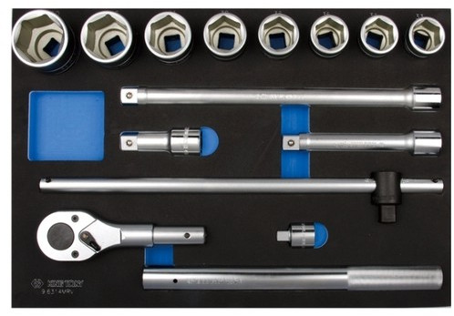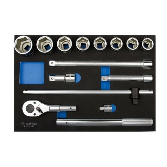 Набор с инструментом торговой марки KING TONY включает в себя торцевые головки и принадлежности формата 3/4", предназначен для работы с крепежом крупногабаритных изделий, устройств и агрегатов.