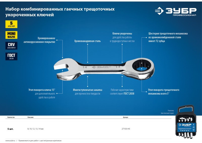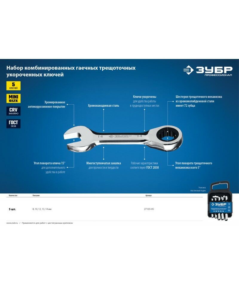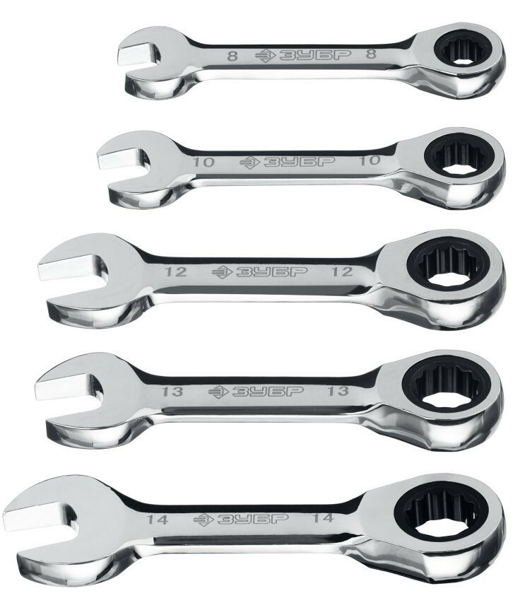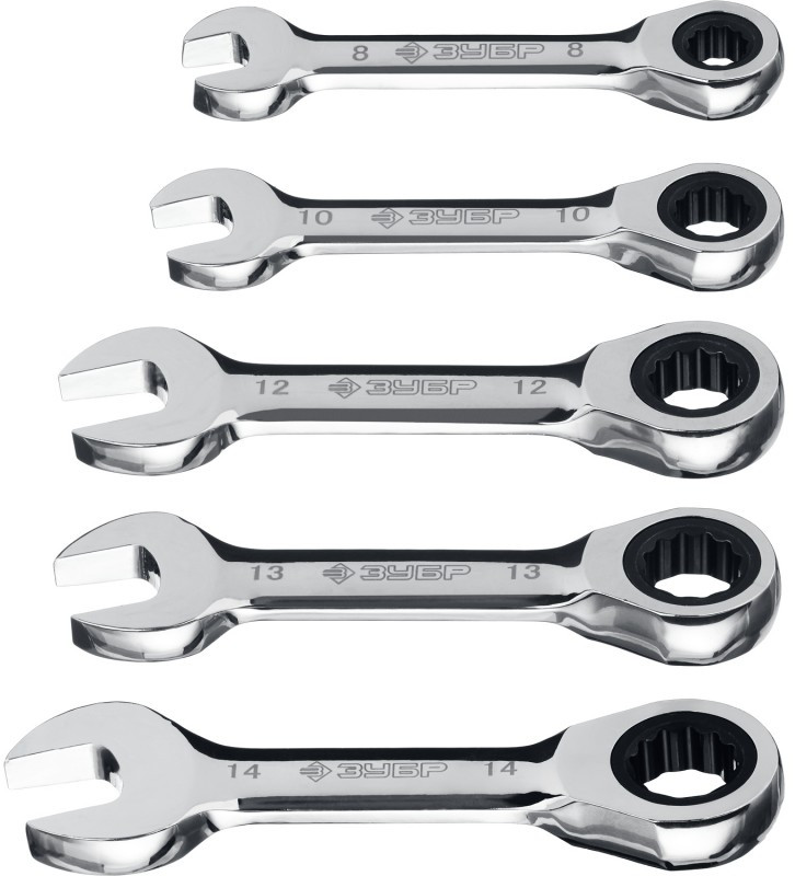 Набор трещоточных комбинированных гаечных ключей укороченных Зубр 8 - 14 мм 5 шт [27103-H5]
