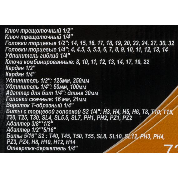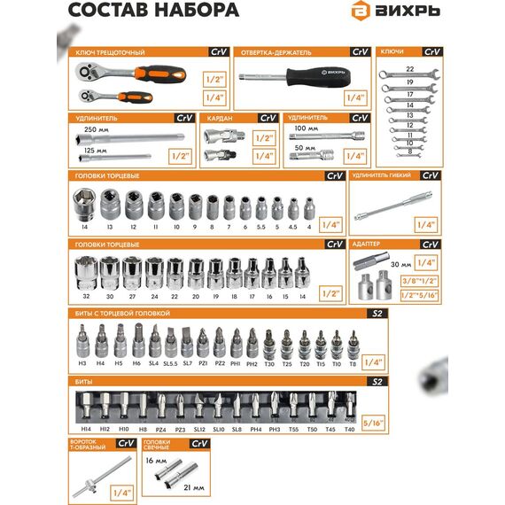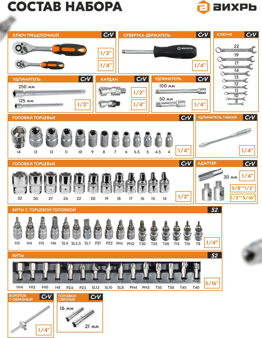 | Головки 1 / 4"DR, список | 4, 4.5, 5, 5.5, 6, 7, 8, 9, 10, 11, 12, 13, 14 мм |