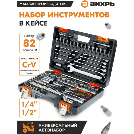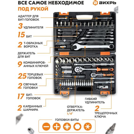 | Дополнительно в наборе, 1 / 4"DR | Удлинитель 1/4": 50, 100 мм.Адаптер для бит 1/4": 25 мм.Вороток Т-образный: 1/4".Кардан: 1/4".Отвертка-держатель для бит: 1/4" |