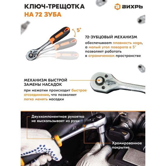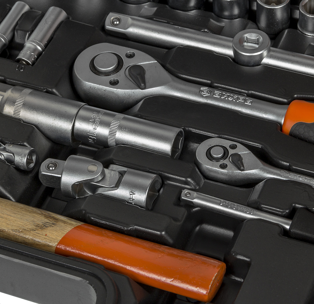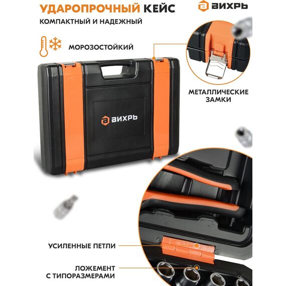 | Дополнительно в наборе, 1 / 2"DR | Удлинители - 125, 250 мм.Адаптер трехсторонний, кардан, ключ трещоточный. |