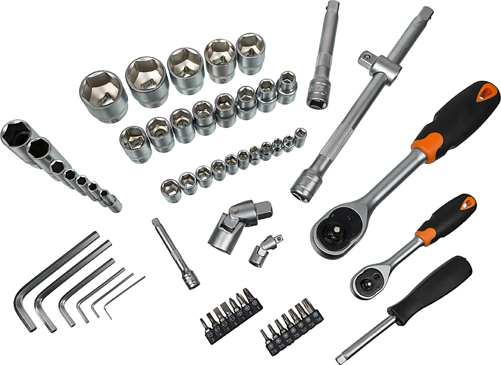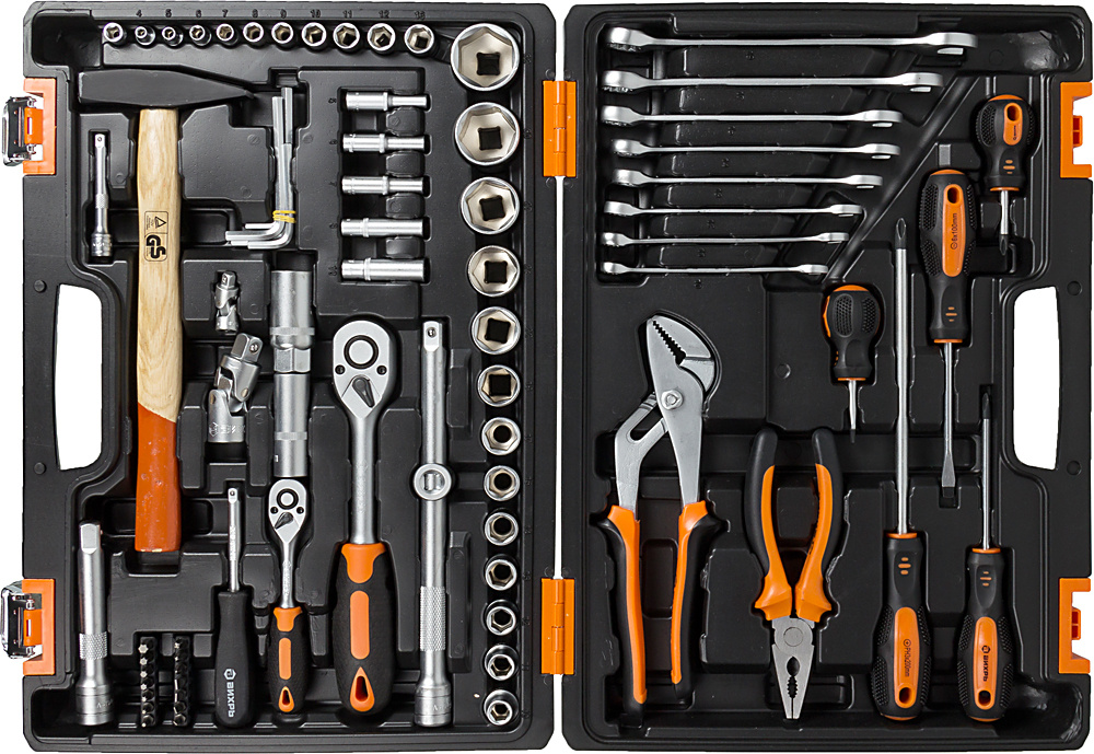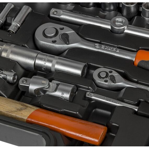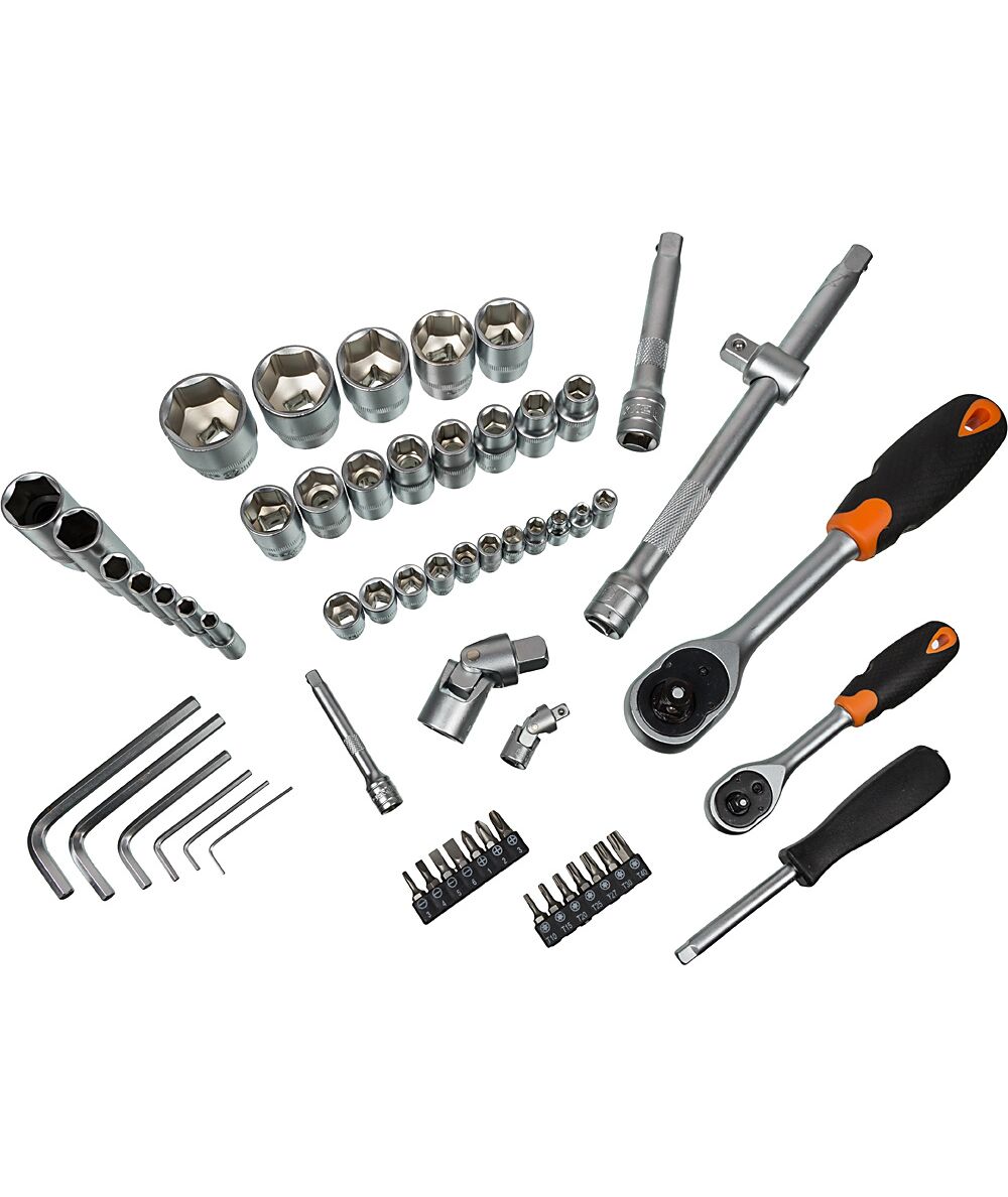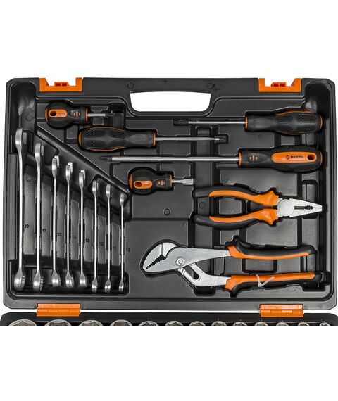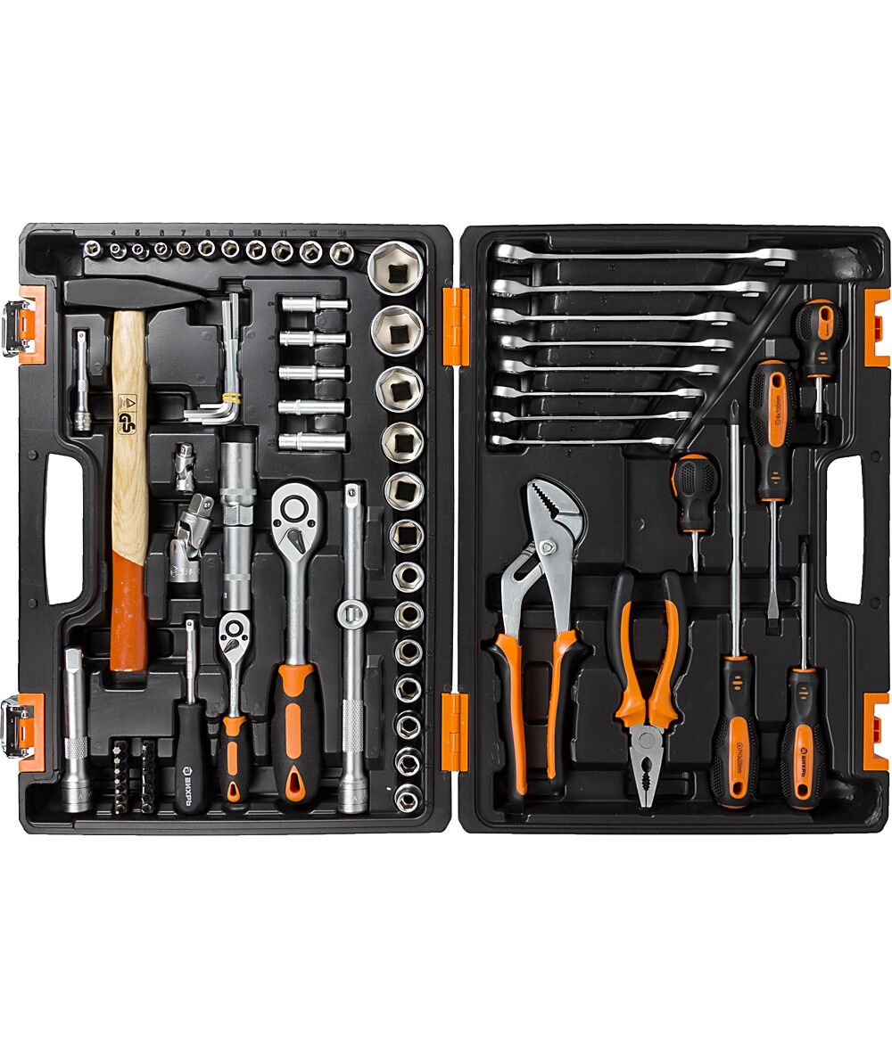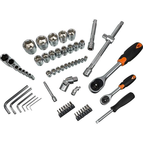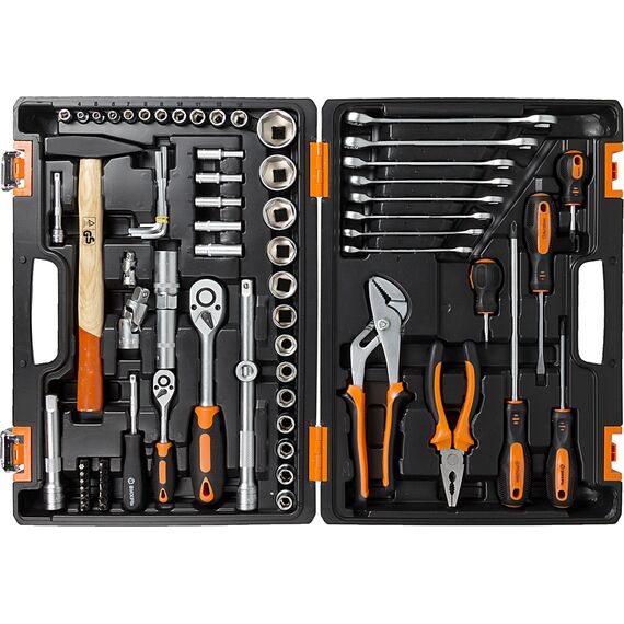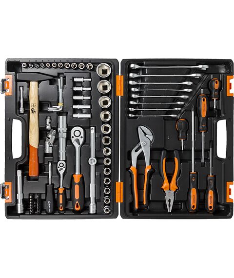 Набор ручного инструмента из 76 предметов, изготовленных из материала CrV в компактном пластиковом кейсе.