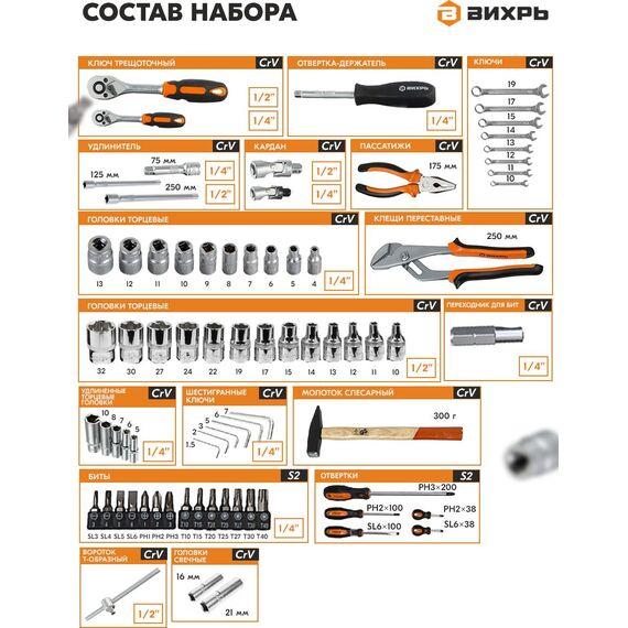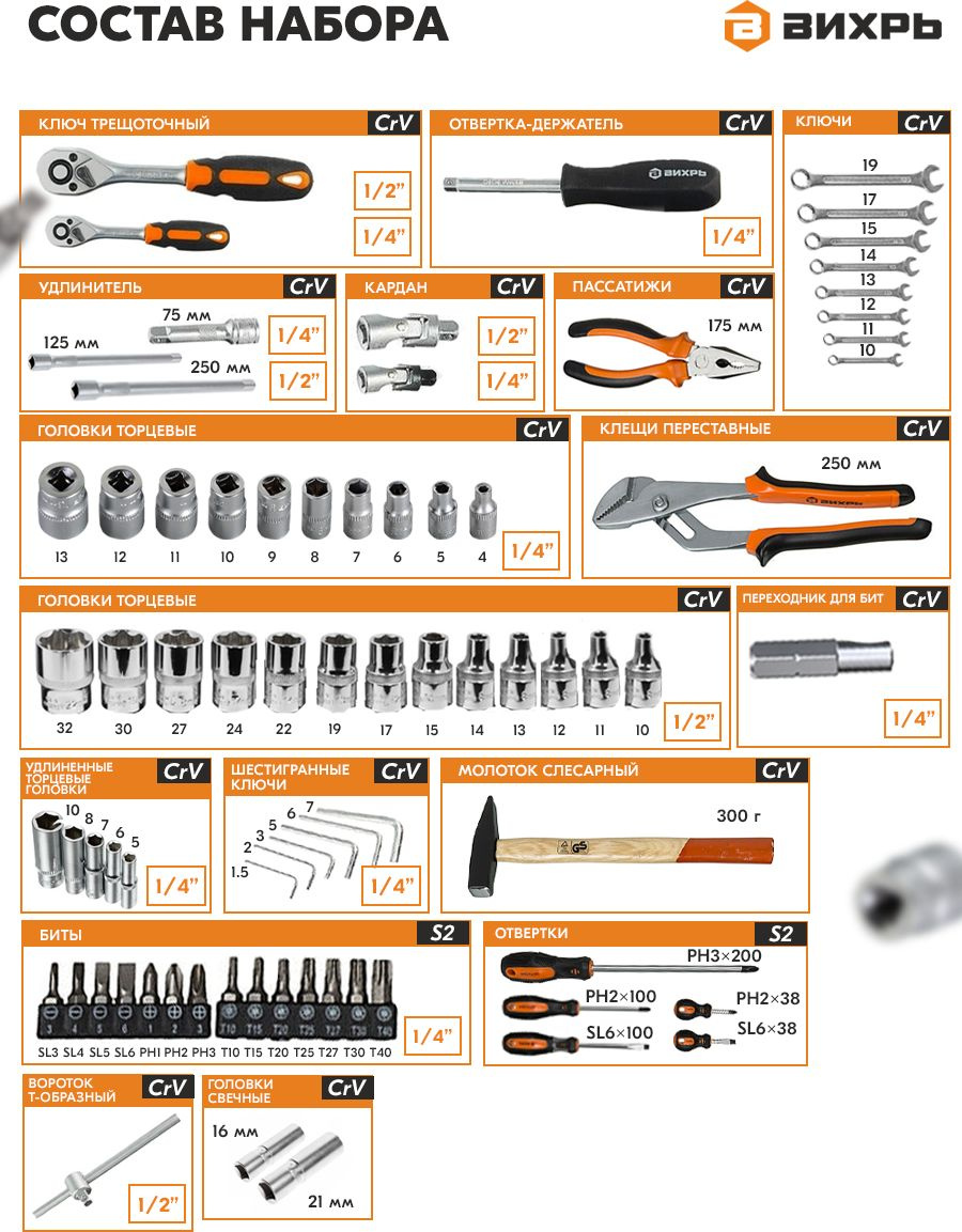 | Головки 1 / 4"DR, список | Головки торцевые 4, 5, 6, 7, 8, 9, 10, 11, 12, 13 мм.Головки торцевые удлинённые 5, 6, 7, 8, 10 мм. |