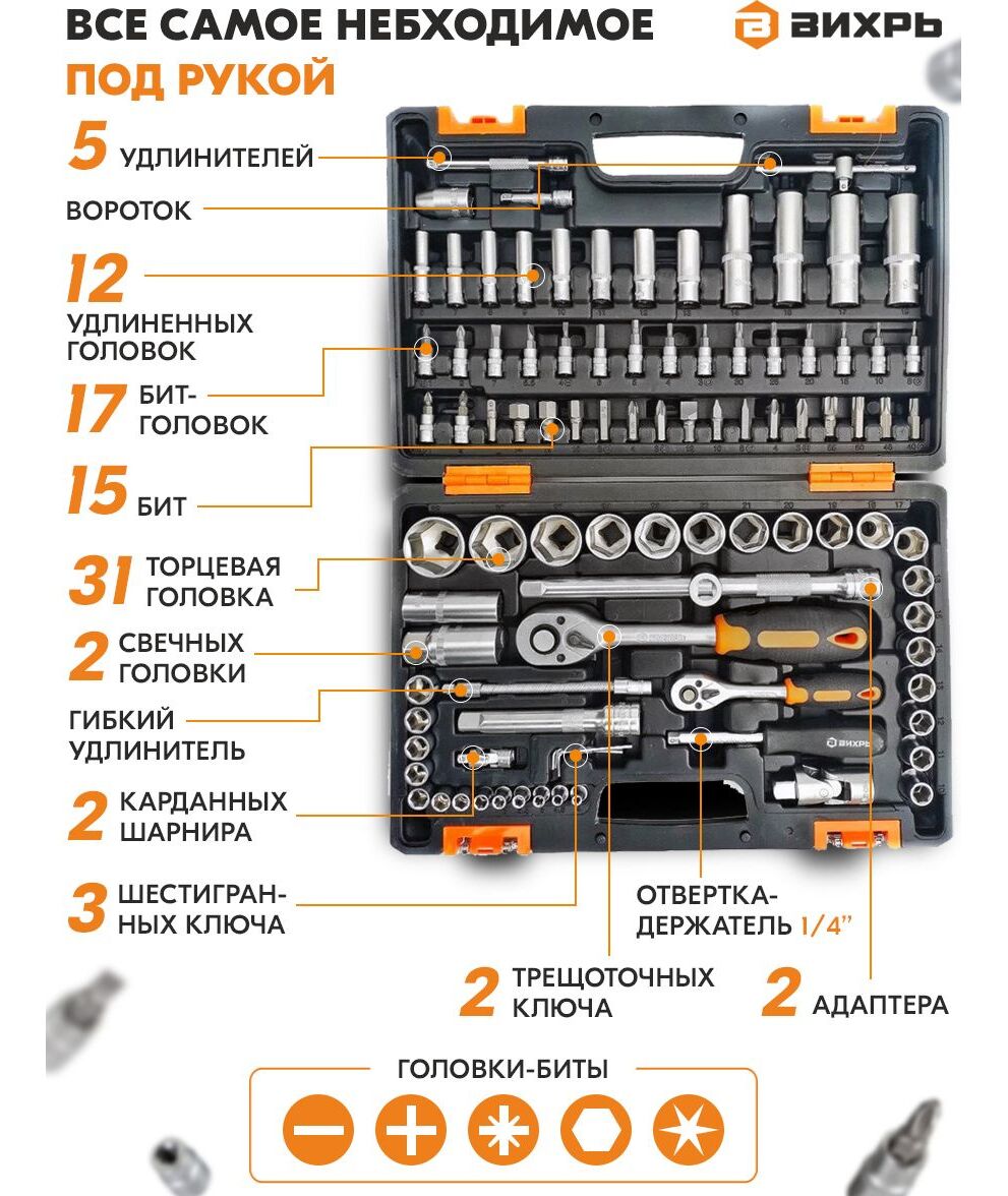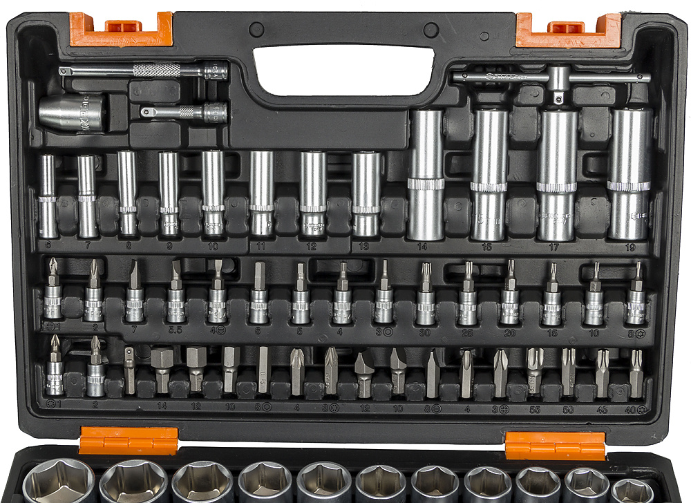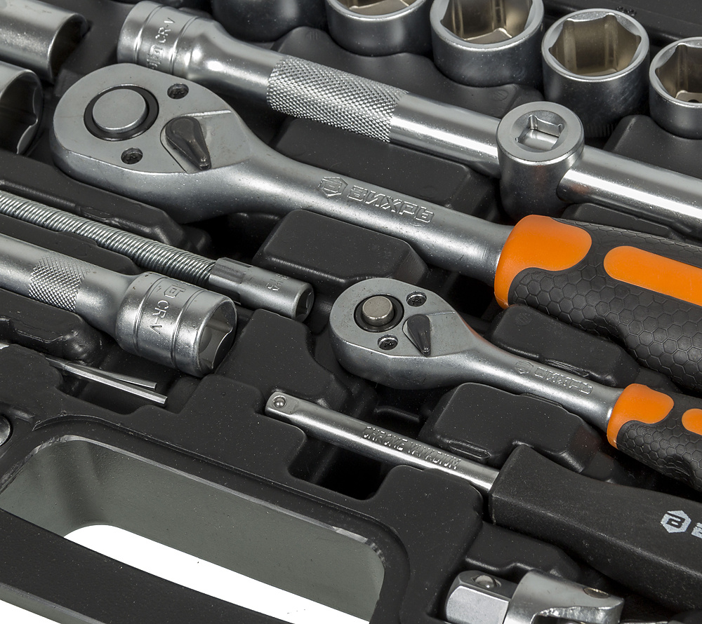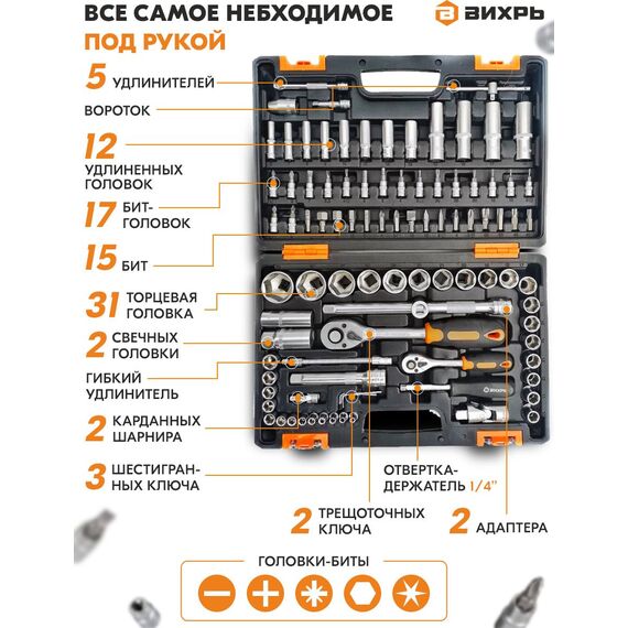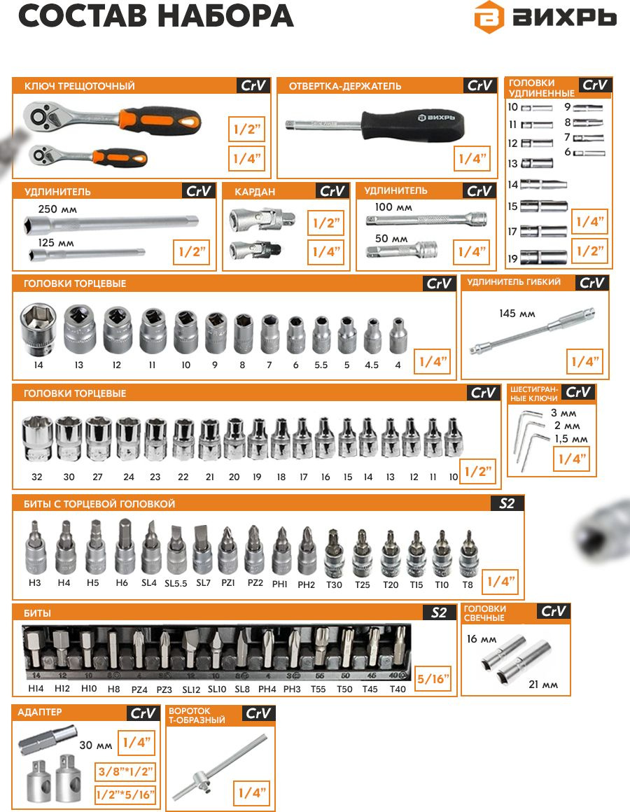 | Дополнительно в наборе, 1 / 4"DR | Удлинители 50, 100 мм, гибкий 145 ммадаптер, вороток Т-образный, карданный шарнир, отверточная рукоятка |
