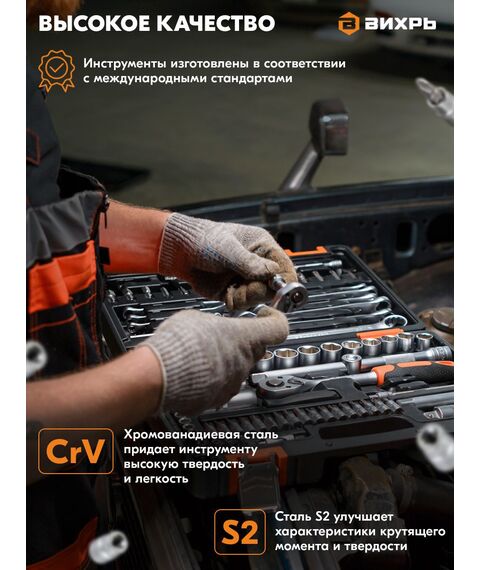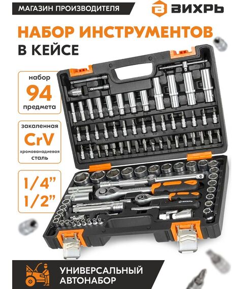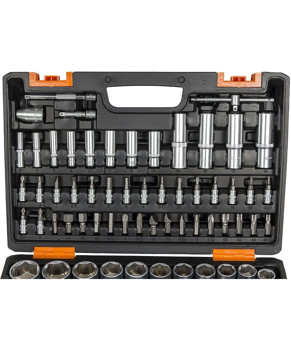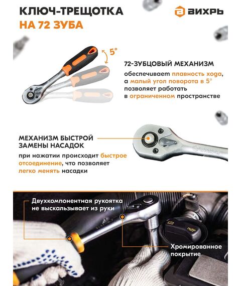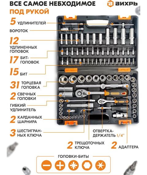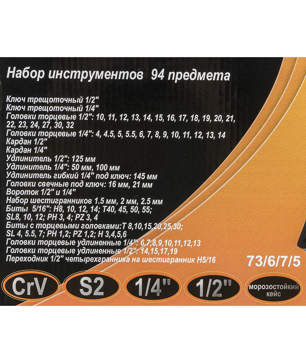 | Дополнительно в наборе, 1 / 4"DR | Удлинители 50, 100 мм, гибкий 145 ммадаптер, вороток Т-образный, карданный шарнир, отверточная рукоятка |