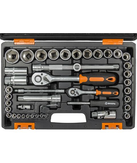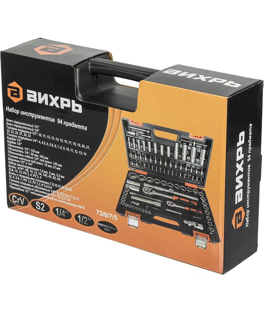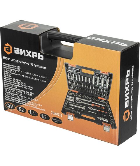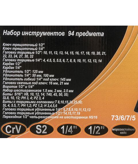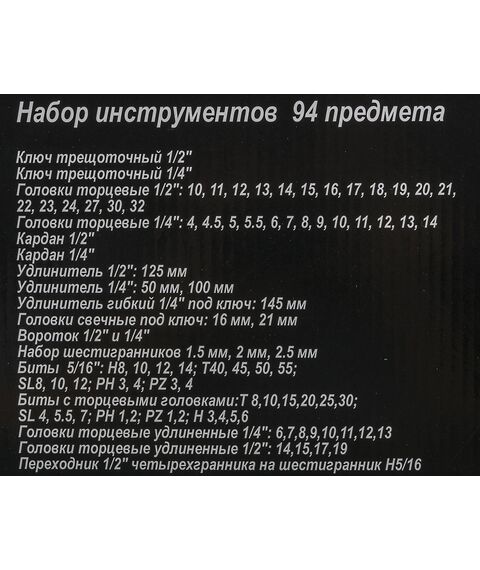 | Дополнительно в наборе, 1 / 2"DR | Удлинители 125, 250 ммадаптер 3-х сторонний, адаптер 5/16", карданный шарнир, ключ трещоточный |