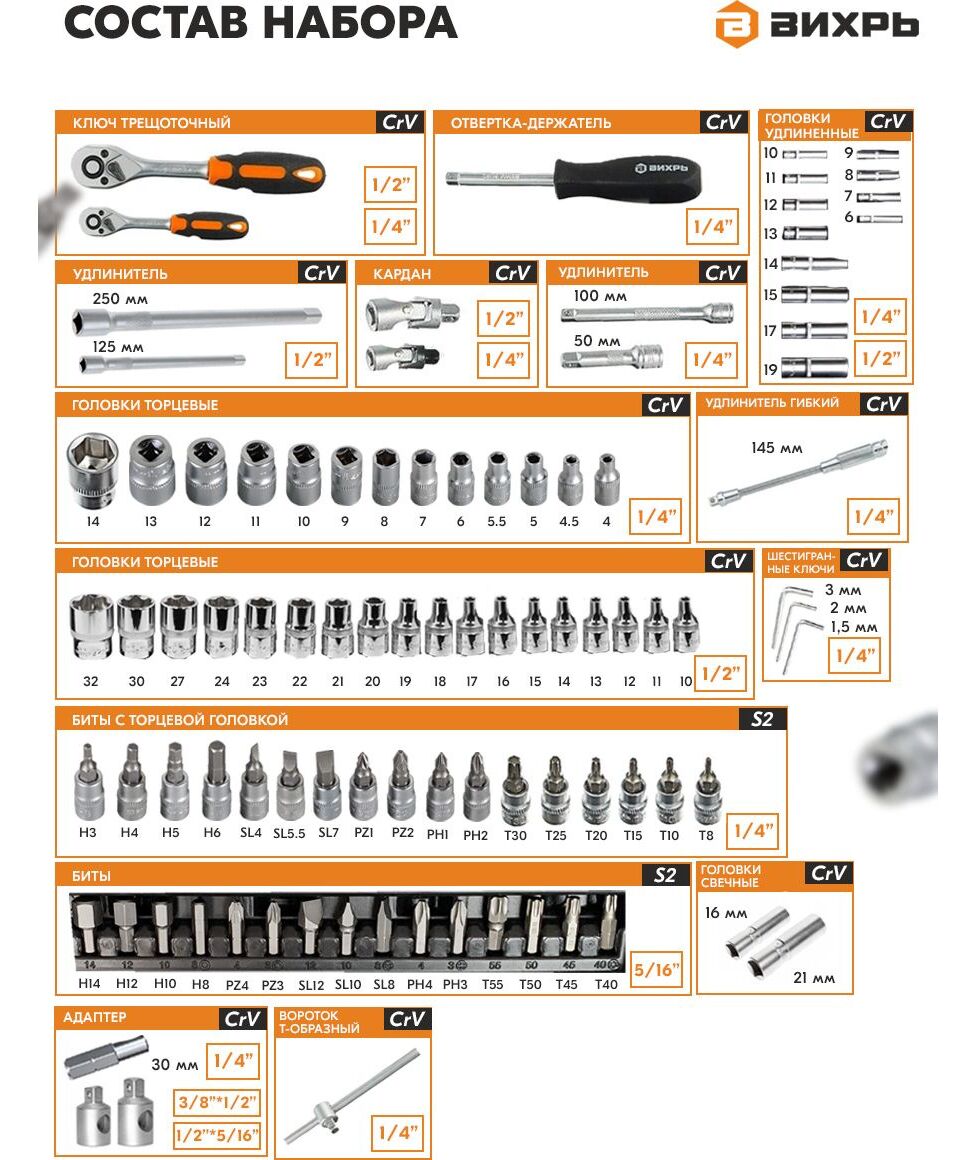 | Головки 1 / 4"DR, список | Головки торцевые 4, 4.5, 5, 5.5, 6, 7, 8, 9, 10, 11, 12, 13, 14 ммГоловки торцевые глубокие 6, 7, 8, 9, 10, 11, 12, 13 ммГоловки торцевые с битами H3, H4, H5, H6, PH1, PH2, PZ1, PZ2, SL4, SL5.5, SL7, T8, T10, T15, T20, T25, T30 |