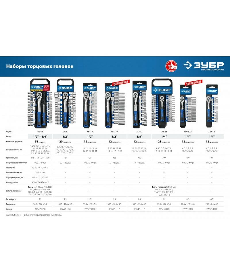 Набор торцовых головок Зубр Профессионал ТМ-12М 12 предметов, (1/4") [27645-H12]