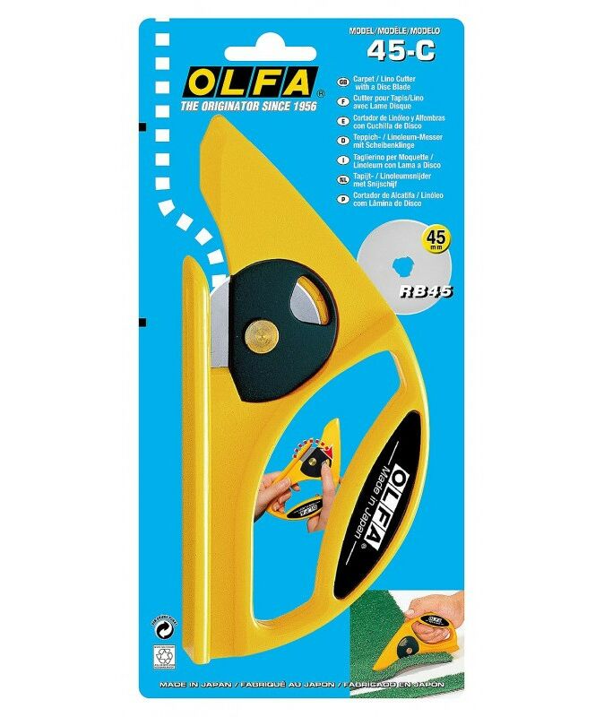 Если нужно разрезать рулонные материалы, такие как ковер, линолеум, ландшафтная ткань, бумага и т. д., то нож с круговым лезвием OLFA 45-C — это то, что Вам нужно.