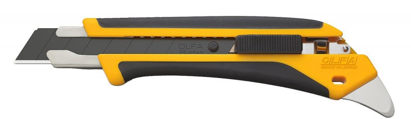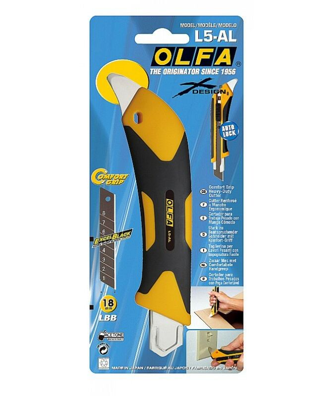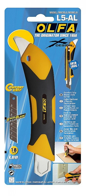 Универсальный нож OLFA L5-AL серии X-design ComfortGrip, с храповым механизмом и металлическим выступом. Легкий и простой в использовании оснащен эргономичной противоскользящей рукояткой устойчивой к кислотам, ацетону и маслам, усиленной фиберглассом. Эта комбинация обеспечивает удобный, надежный захват при выполнении самых сложных работ. Поставляется с черным лезвием LBB шириной 18 мм, которое на 25% острее стандартных лезвий OLFA. Просто отломите один из восьми сегментов, если лезвие затупилось. Полная замена происходит быстро и без дополнительных инструментов. Многоцелевой металлический выступ делает нож еще более практичным и удобным. Используйте выступ для любых задач, где нельзя использовать лезвие: для удаления герметика, открывания банок или снятия выпускных пластин. Это полезное дополнение гарантирует, что острые как бритва лезвия OLFA останутся чистыми и невредимыми.