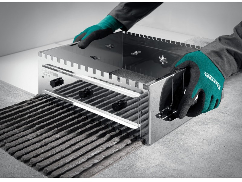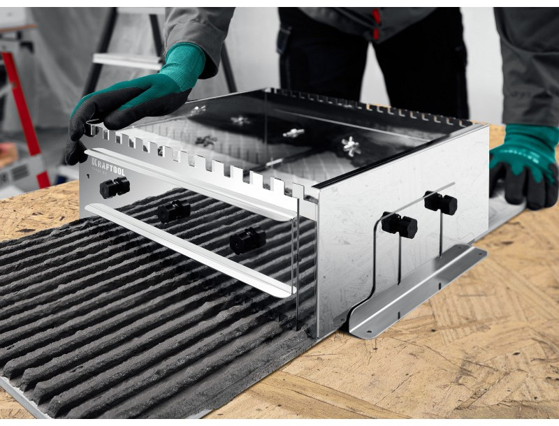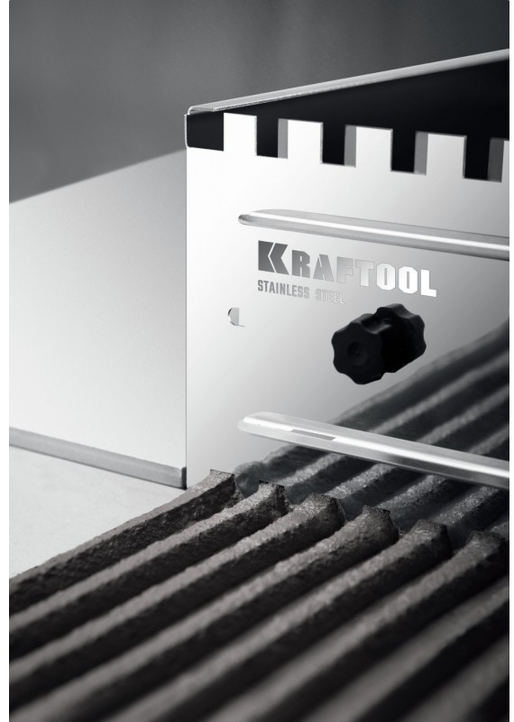 Имеет 4 рабочих профиля с величиной зубьев 8, 10, 12 и 14мм для универсального подхода к любым задачам. Боковые регуляторы помогут закрепить гребенку на рабочей поверхности и настроить её по высоте под любую плитку. Легко моется, не боится влаги.
