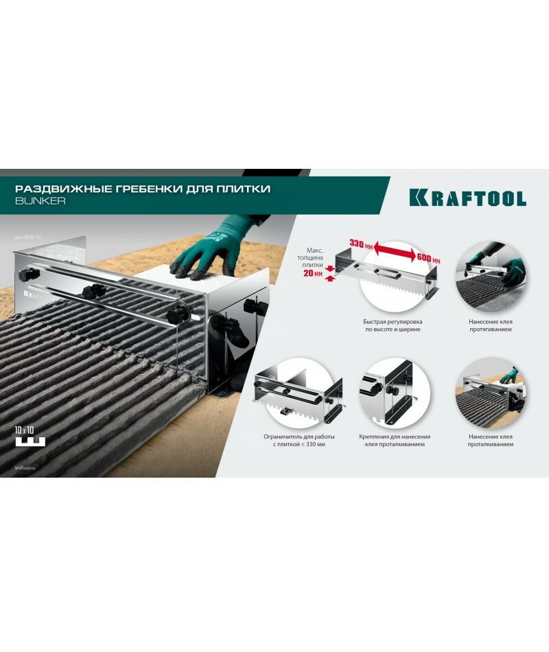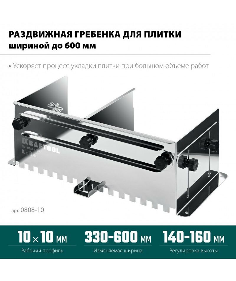 Раздвижная гребенка для плитки KRAFTOOL BUNKER зуб 10*10 мм до 600 мм, нерж. сталь [0808-10]