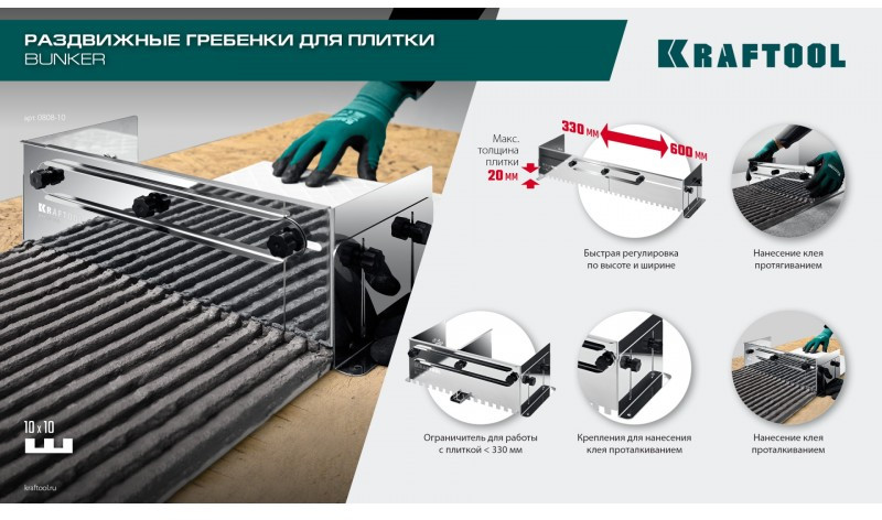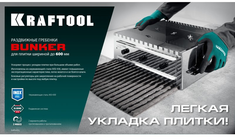 Раздвижная гребенка для плитки KRAFTOOL BUNKER зуб 12*12 мм до 600 мм, нерж. сталь [0808-12]