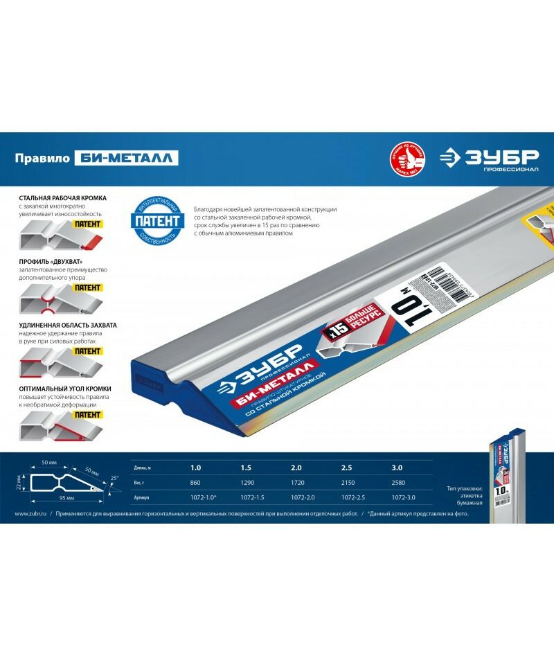 - Благодаря новейшей запатентованной конструкции со стальной закаленной рабочей кромкой, срок службы увеличен в 15 раз по сравнению с обычным алюминиевым правилом