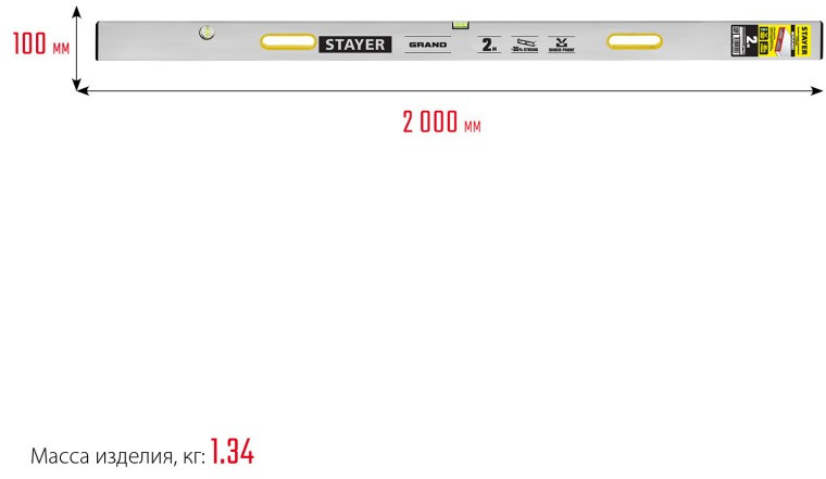 Правило с уровнем и ручками STAYER GRAND 2 м точность 1 мм/м, 2 глазка [10752-2.0]