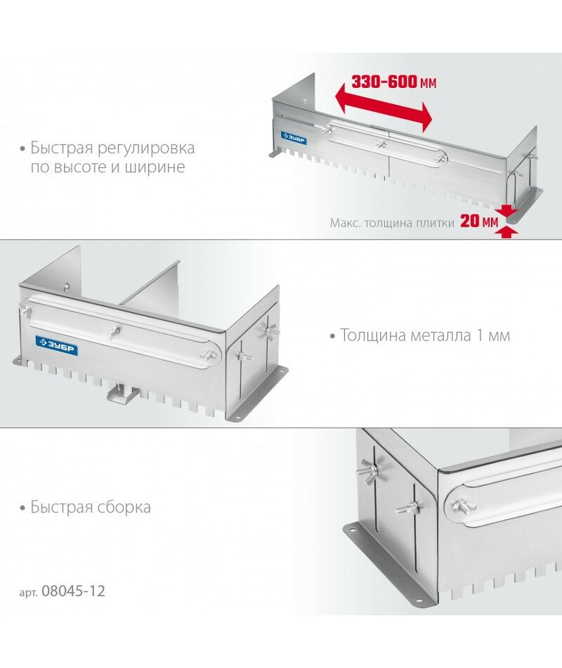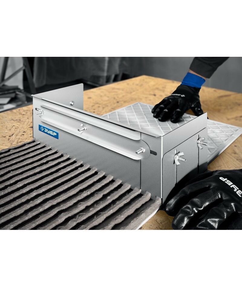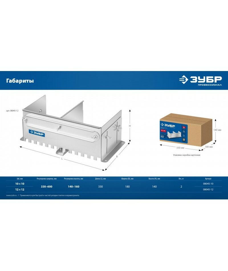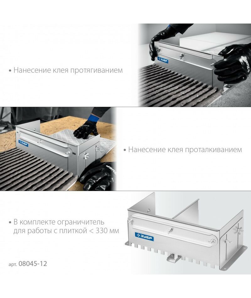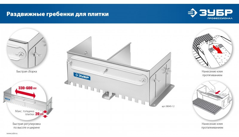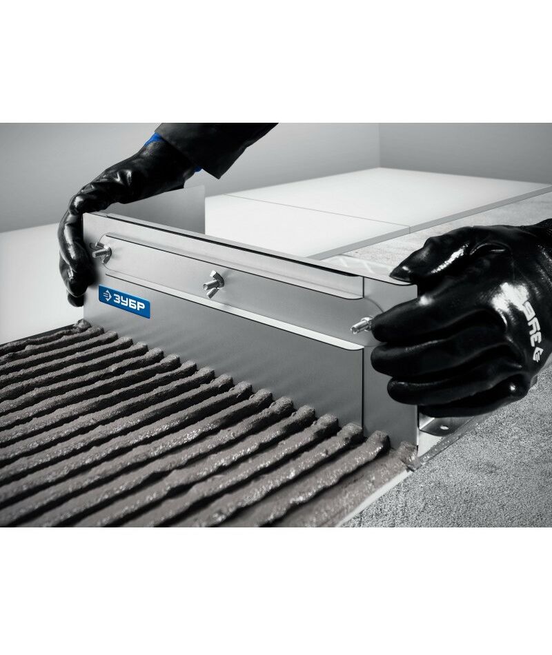 Имеет величину зуба 12мм. Боковые регуляторы помогут закрепить гребенку на рабочей поверхности и настроить её по высоте под любую плитку. В комплекте имеется дополнительная секция, благодаря которой гребенку можно использовать даже с самыми узкими плитками. Легко моется, не боится влаги.
