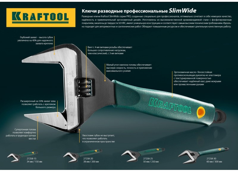 Профессиональные разводные ключи Kraftool изготовлены из высококачественной хромованадиевой стали, соответствуют самым высоким техническим требованиям, фосфатированное покрытие защищает от коррозии. Обладают повышенным ресурсом и обеспечивают длительную и качественную работу.