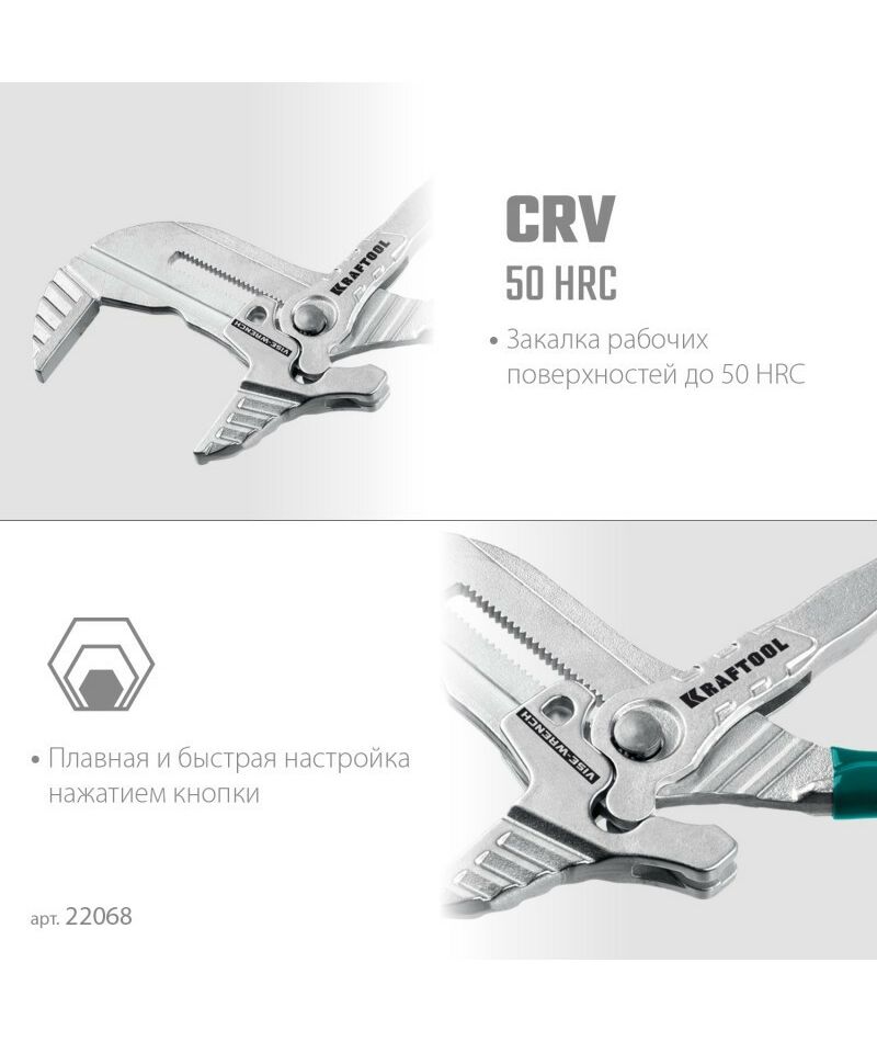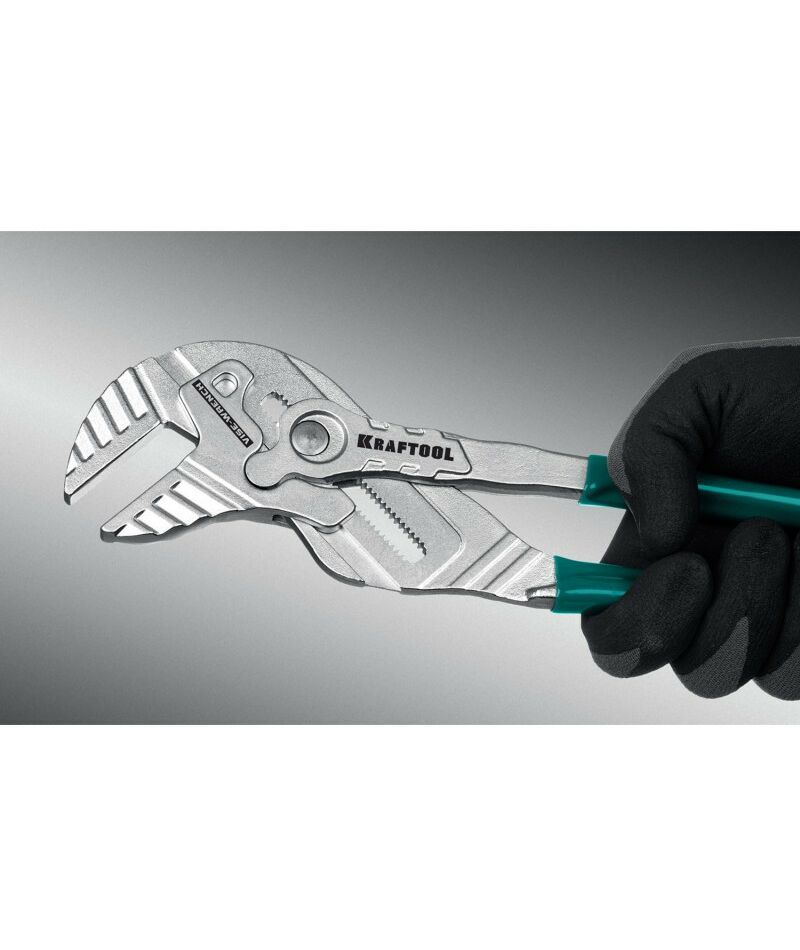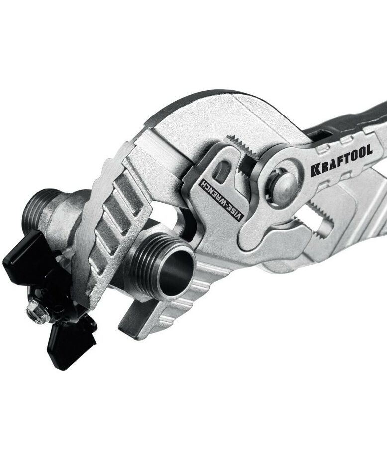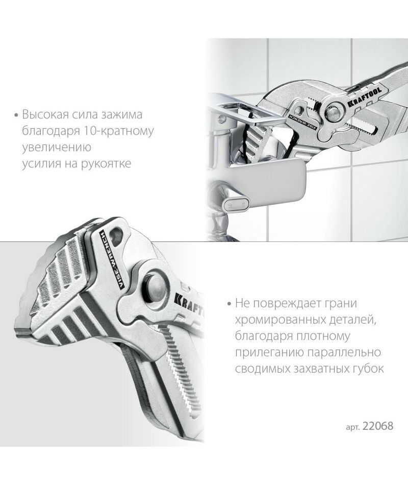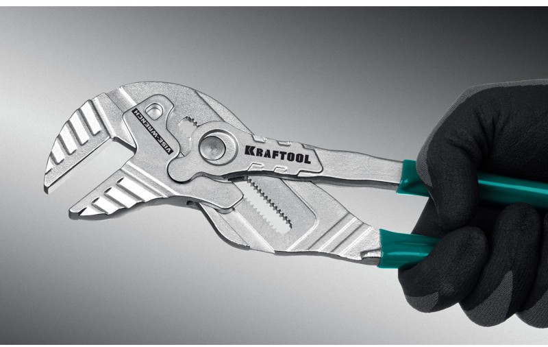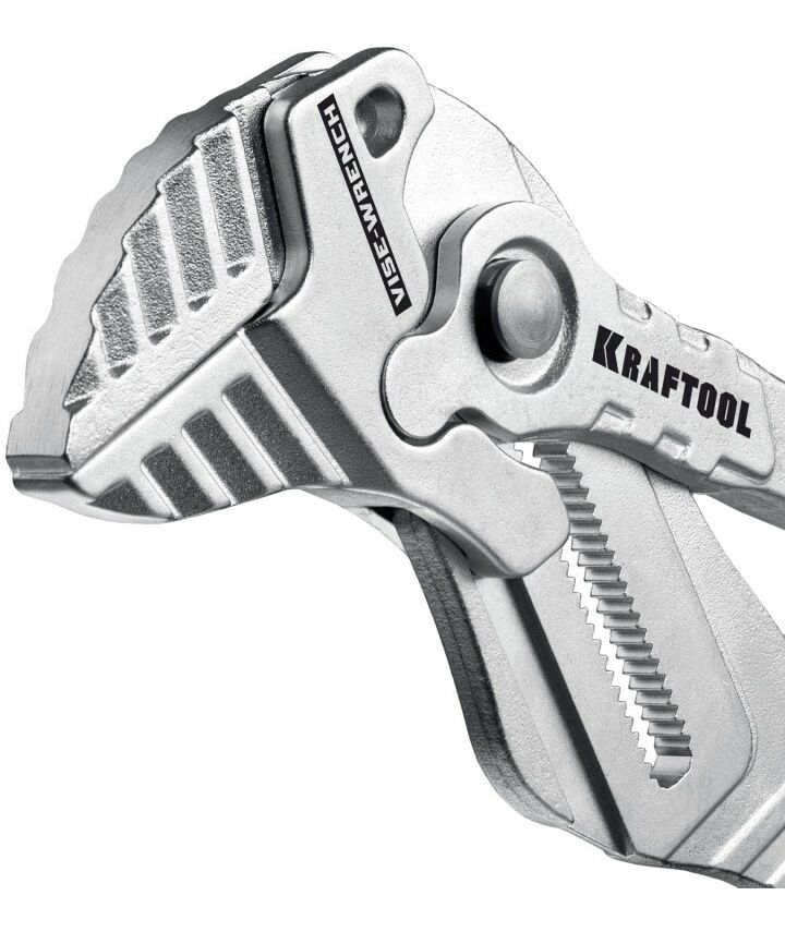 Клещи переставные-гаечный ключ KRAFTOOL – профессиональный инструмент с постоянно параллельными губкам. Заменит набор из всех ключей и обеспечит полную сохранность хромированного крепежа.